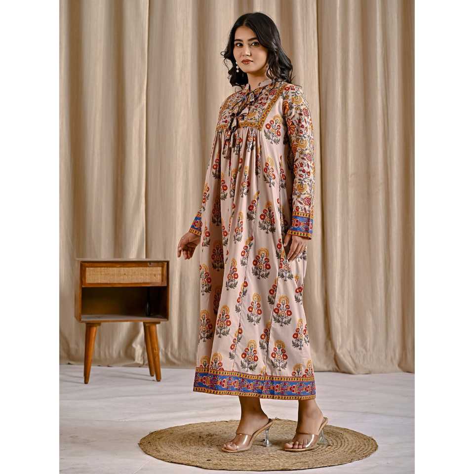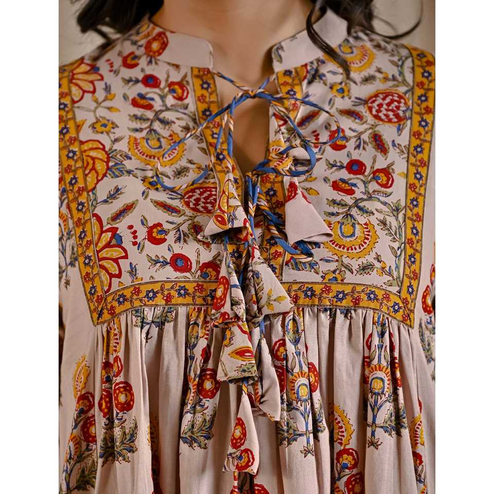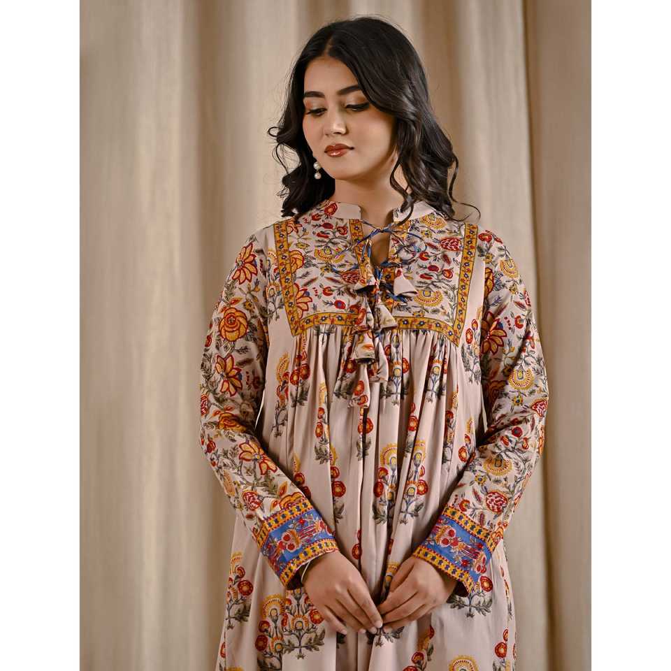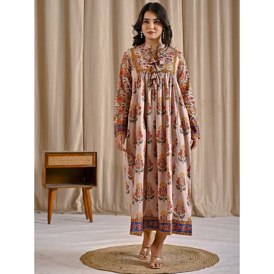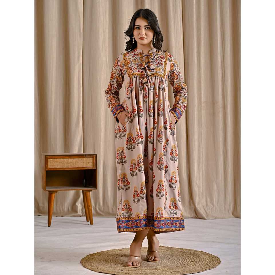 เดรสผ้าฝ้ายสีเบจเหลืองพิมพ์ลายทรงบานพร้อมพู่ด้านหน้า สไตล์ลำลองหรูหรา ระบายอากาศได้ดี เหมาะสำหรับวันหยุดพักผ่อนและออกงานกลางคืน (ODM)