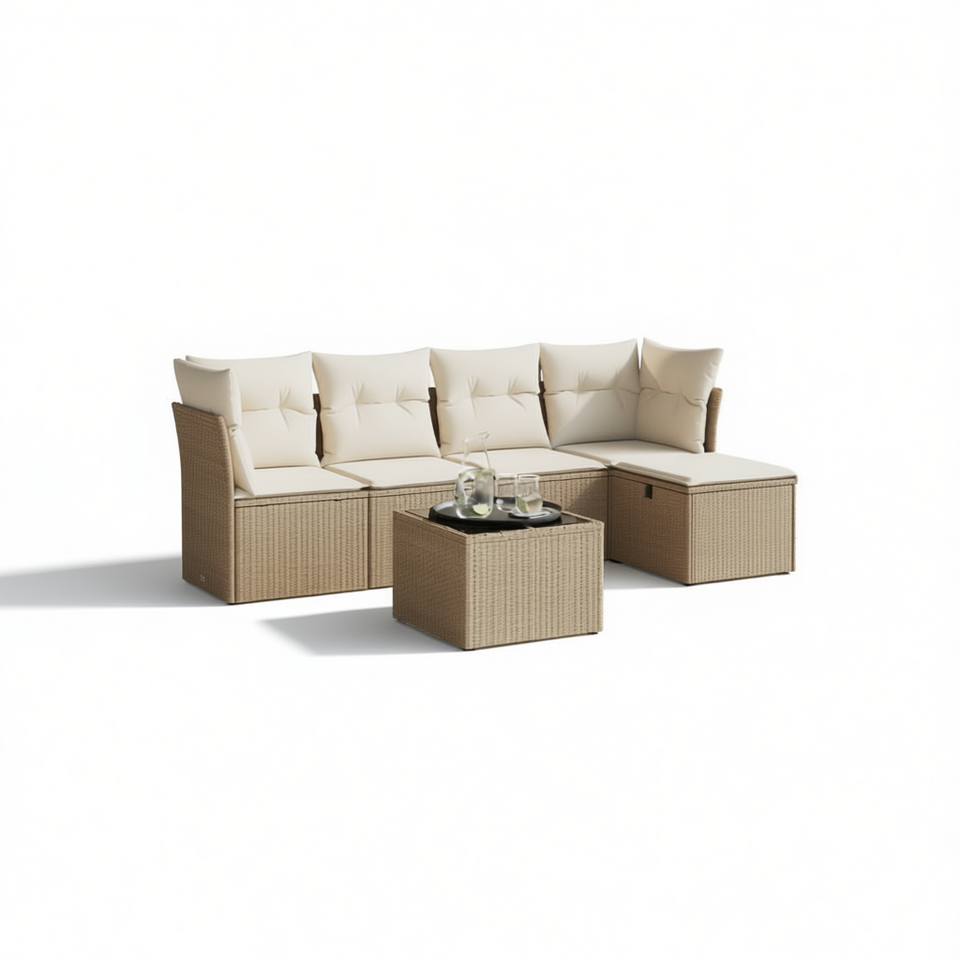 ชุดโซฟาหวายสีเบจสำหรับสวน 4 ที่นั่ง เฟอร์นิเจอร์กลางแจ้ง ทนทานต่อสภาพอากาศ ดีไซน์ร่วมสมัย