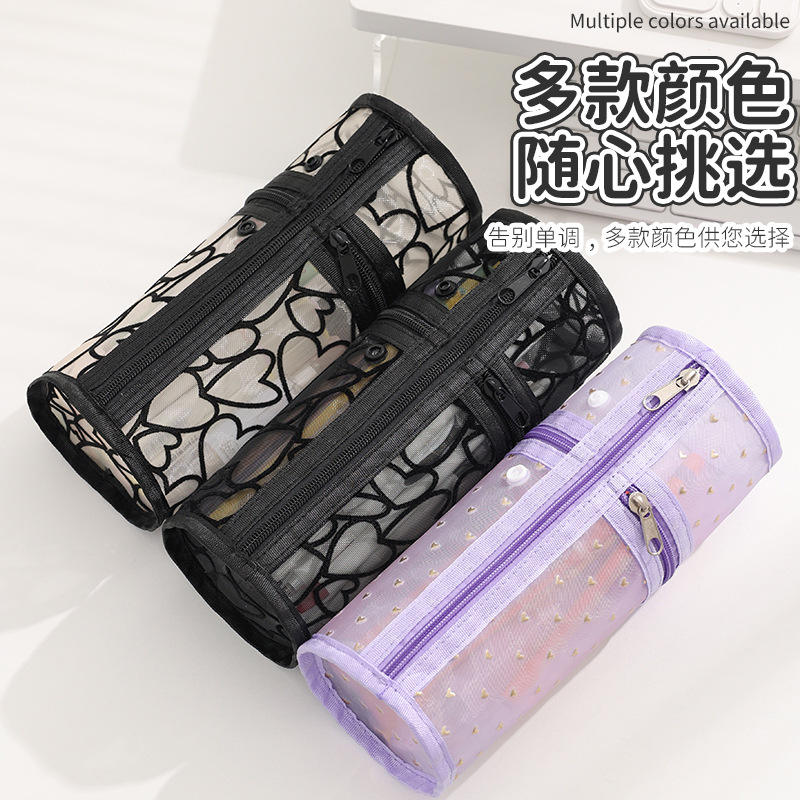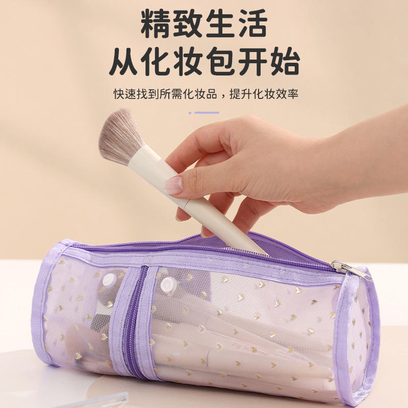 กระเป๋าเครื่องสำอางทรงกระบอก Beilian Mesh ความจุขนาดใหญ่ กล่องเก็บเครื่องสำอางแบบพกพาสำหรับเดินทาง พร้อมซิปหลายช่อง