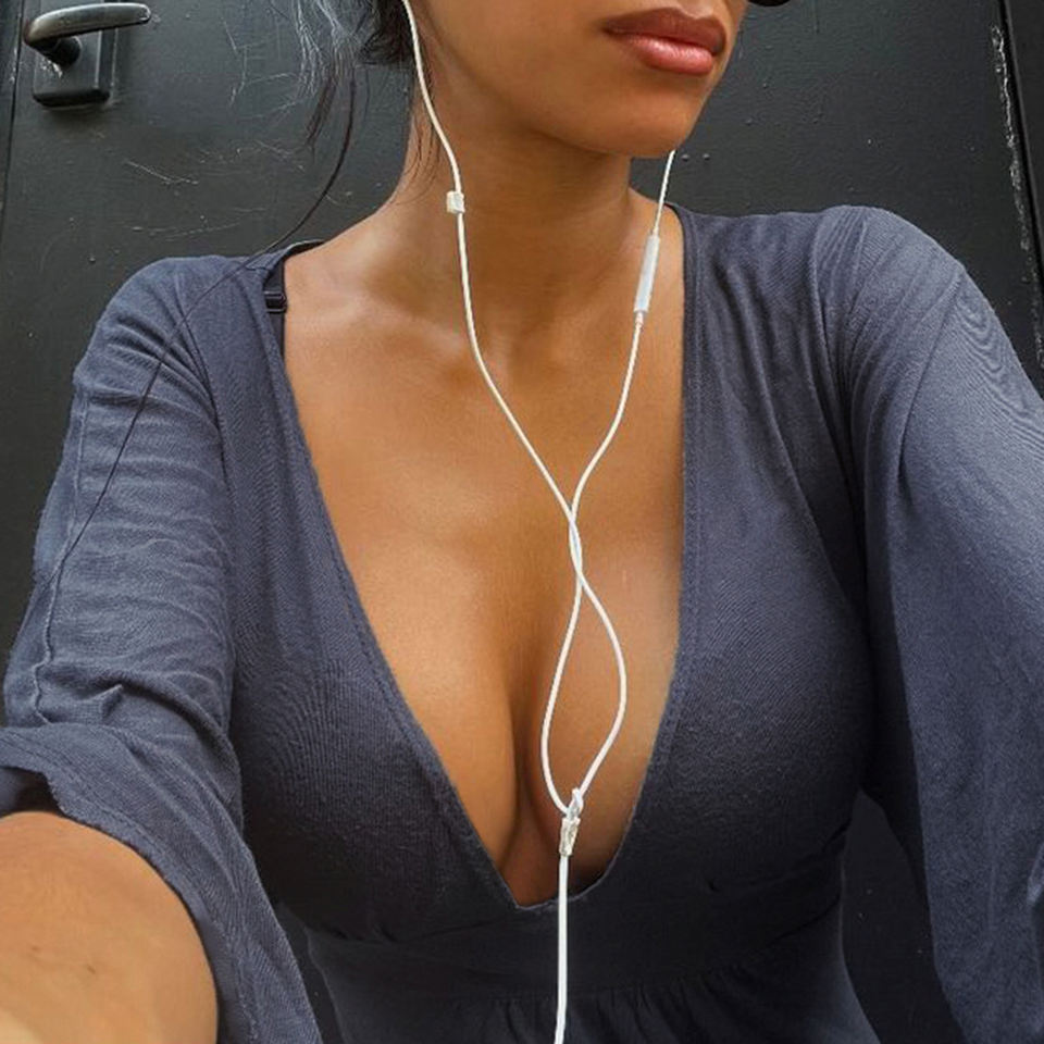 เสื้อแขนกระดิ่งสีพื้นถักนิตติ้งพิมพ์ลายดิจิทัลรักษ์โลก คอวีเซ็กซี่ ความยาวปานกลาง พร้อมดีเทลทันสมัย