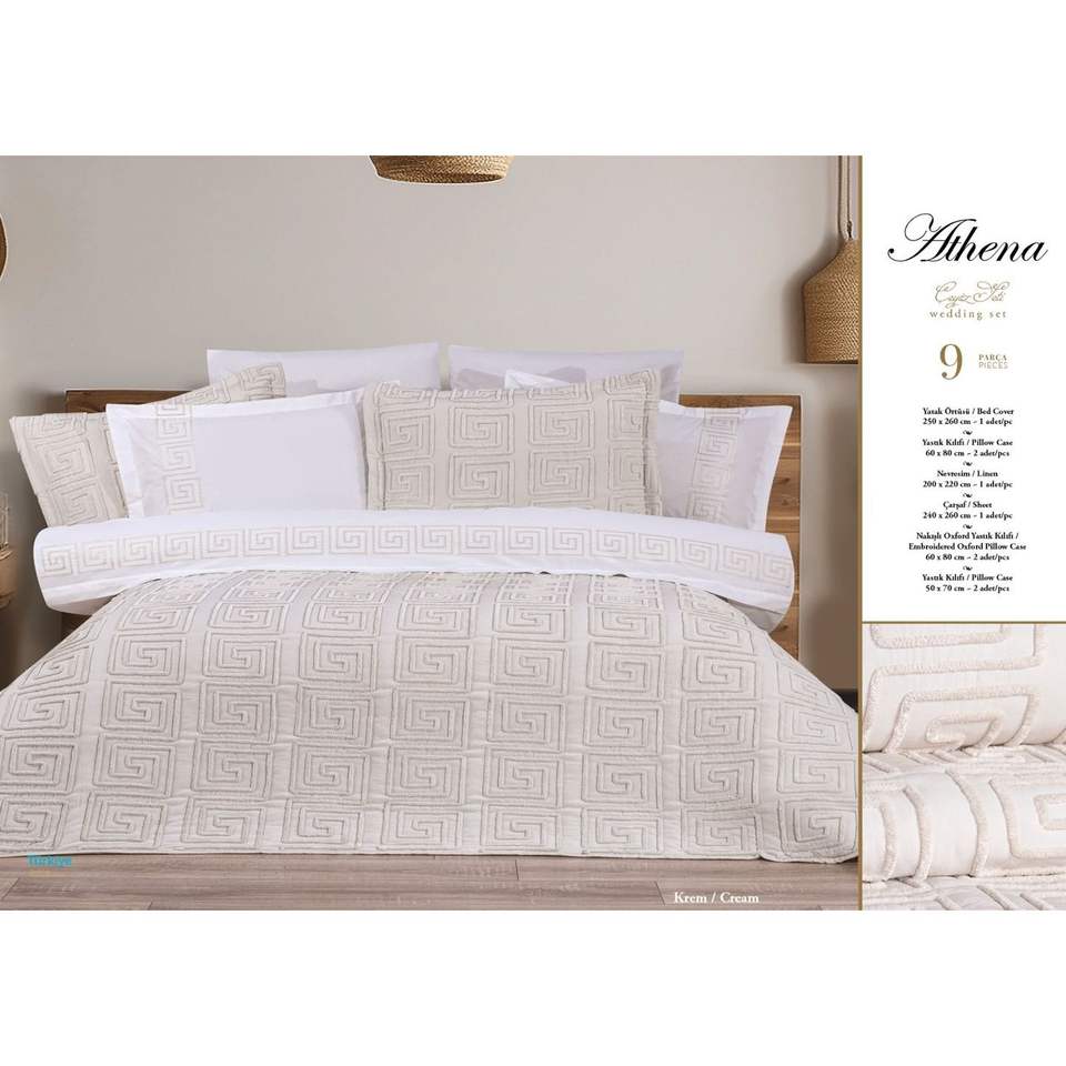 ชุดเครื่องนอนเบลล่าโฮม อะธีนา บริดัล เซ็ต 9 ชิ้น สีครีม ลายปักเรขาคณิต ผ้าไมโครไฟเบอร์โพลีเอสเตอร์ 300 เส้นด้าย คลาสสิค ประกอบด้วยผ้าปูที่นอน 3 ชิ้น