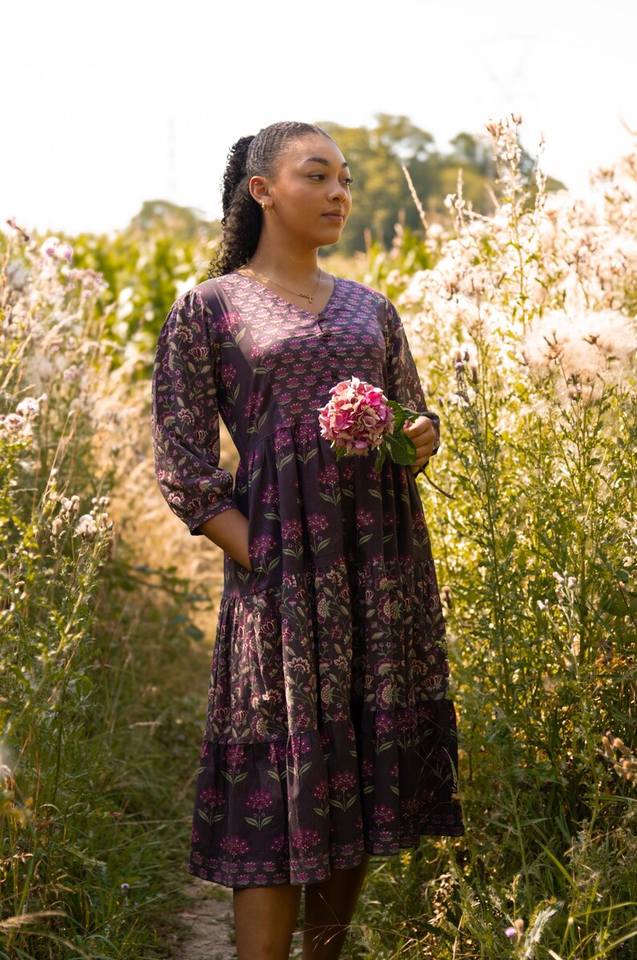 ชุดเดรสผ้าฝ้ายพิมพ์ลายบล็อกแบบโบฮีเมียนของเบลล์ สไตล์ลำลอง แฟชั่นที่เป็นมิตรต่อสังคม เหมาะสำหรับใส่ในช่วงฤดูร้อน