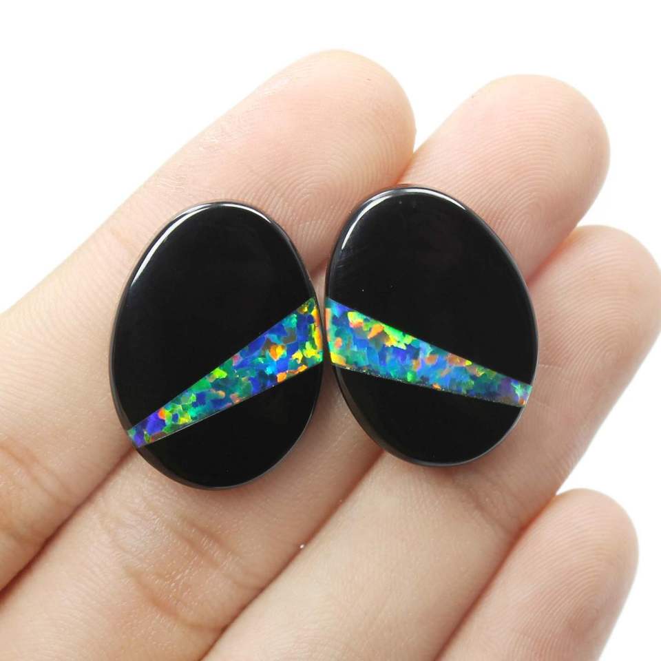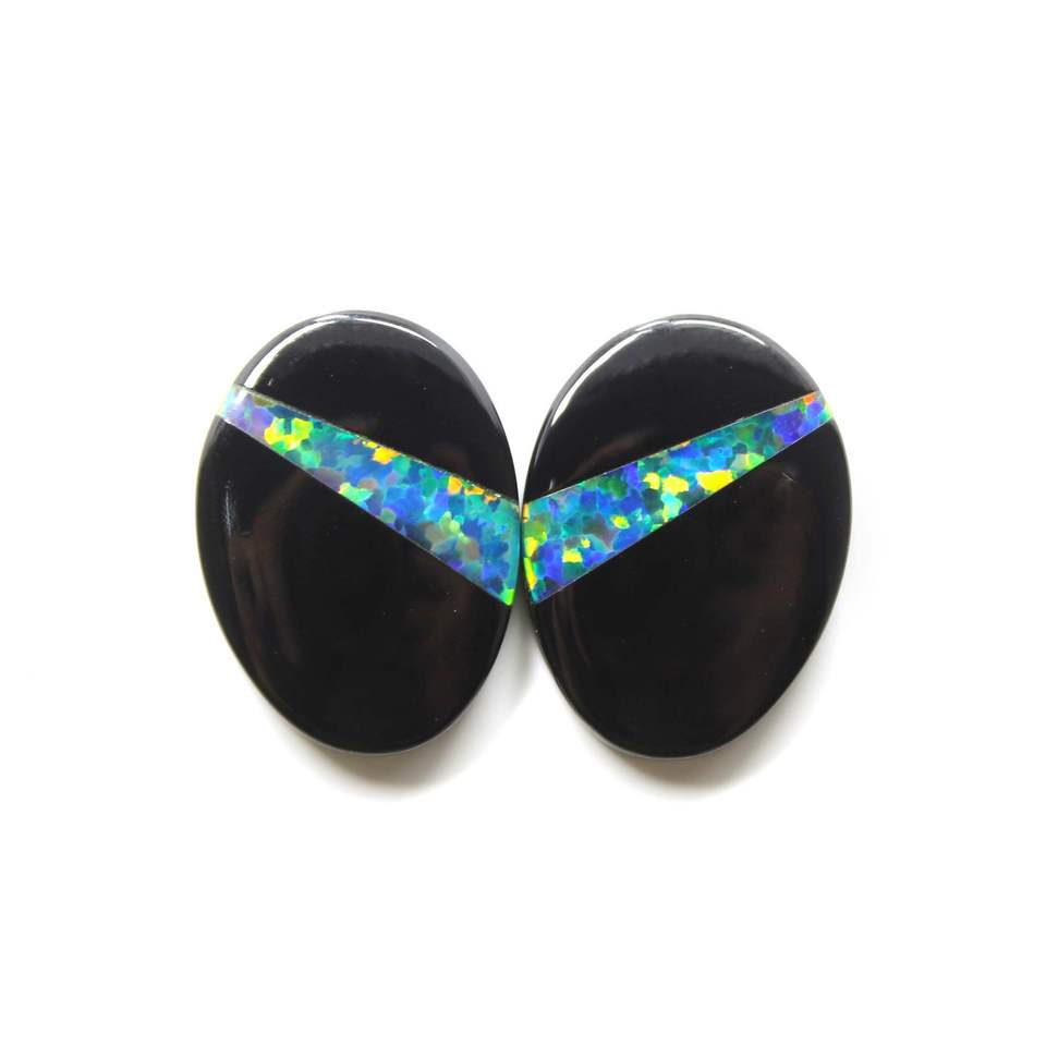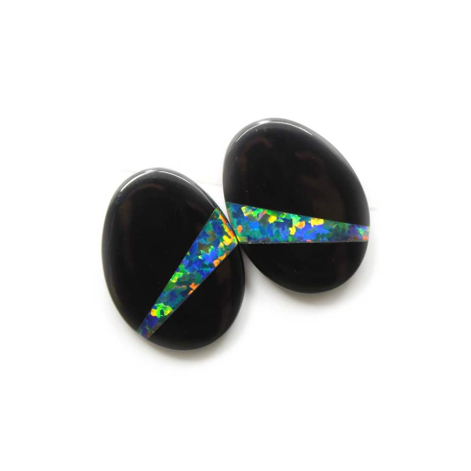 ต่างหูพลอยโอปอลสังเคราะห์เบลโล่ แบล็คออนิกซ์ ดับเบิ้ลท์ รูปไข่ ขนาด 25x18 มม. พลอยธรรมชาติคุณภาพสูงคู่หนึ่ง