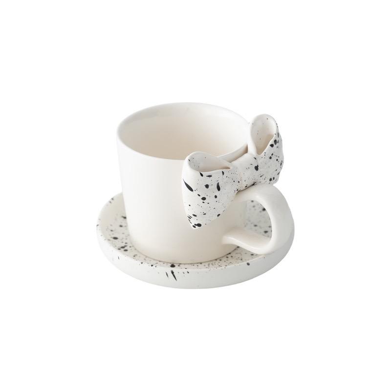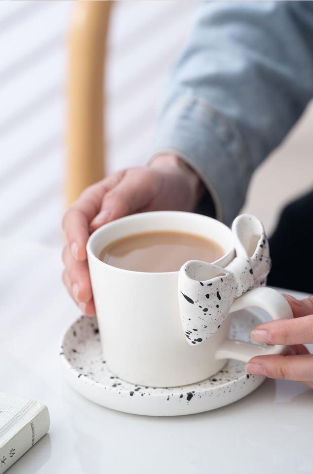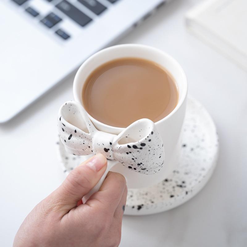 ถ้วยชาแบบมีหูจับรูปโบว์ จานรองเซรามิก ถ้วยน้ำ ขวดน้ำ แก้วกาแฟ เครื่องดื่มพอร์ซเลน ภาชนะใส่เครื่องดื่มสุดหรูสำหรับบ้าน ครัว และโต๊ะอาหาร