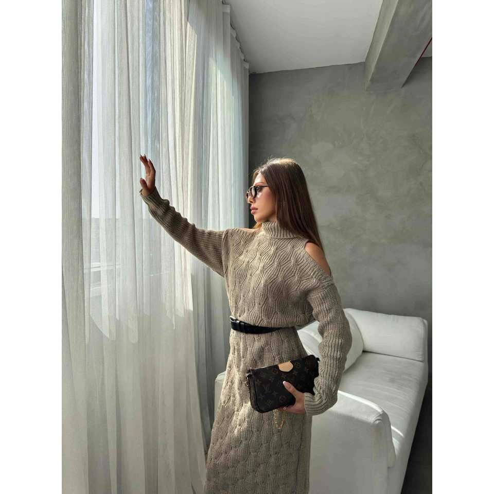 เดรสไหมพรมคอเต่าแบบมีเข็มขัด แขนเปิดไหล่ สีเบจ ไซส์ S สำหรับผู้หญิง
