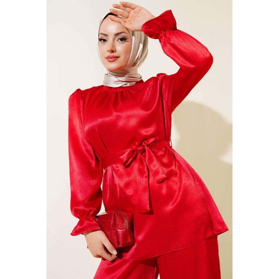 ชุด2ชิ้นแวววาวสายคาดสีแดงของผู้หญิง
