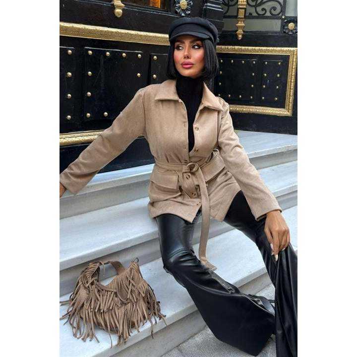 เสื้อแจ็คเก็ตเชิ้ตหนังกลับมีเข็มขัดสำหรับผู้หญิง แขนยาว สีเบจ ไซส์ L สำหรับฤดูใบไม้ร่วง