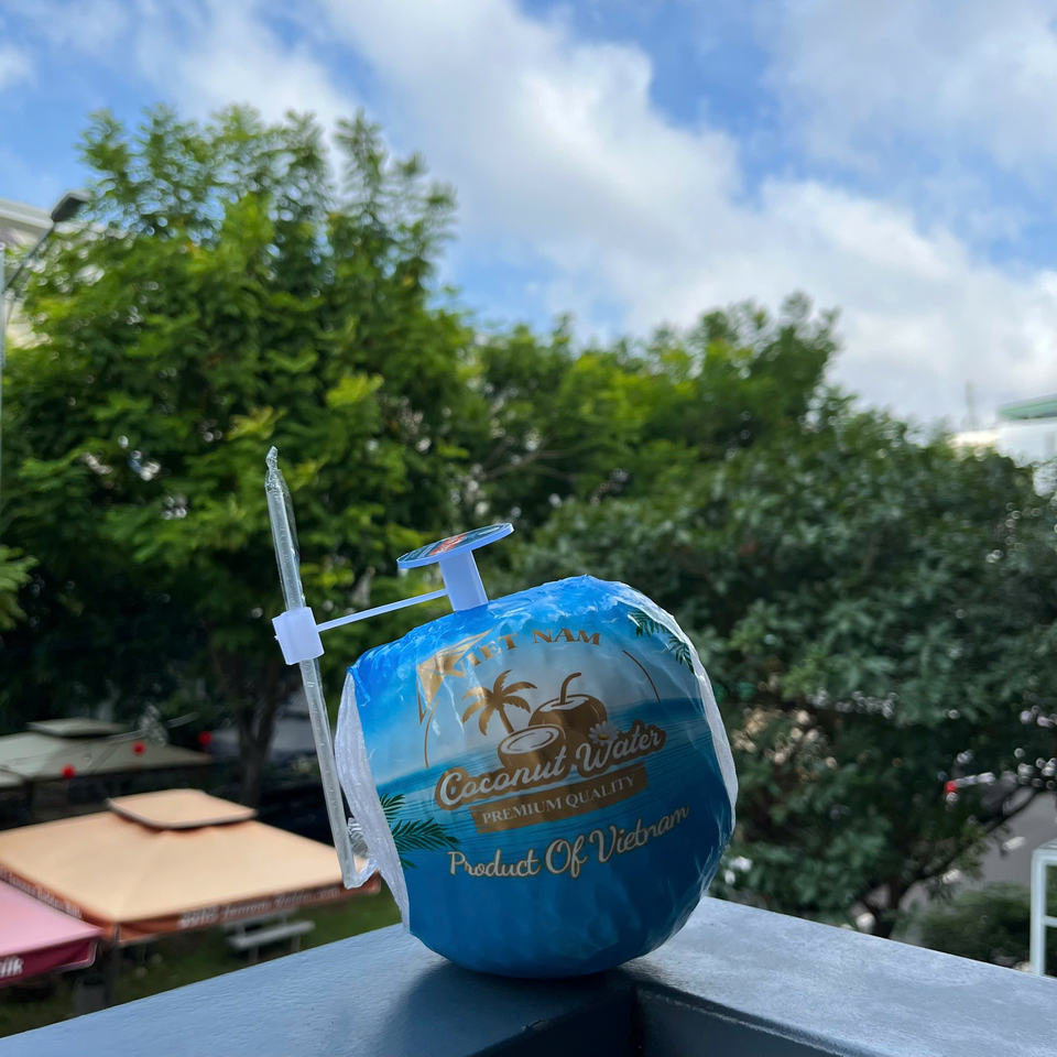 มะพร้าวกึ่งแกลบสดสำหรับดื่มโดยมีผลไม้และส่วนเปลือก
