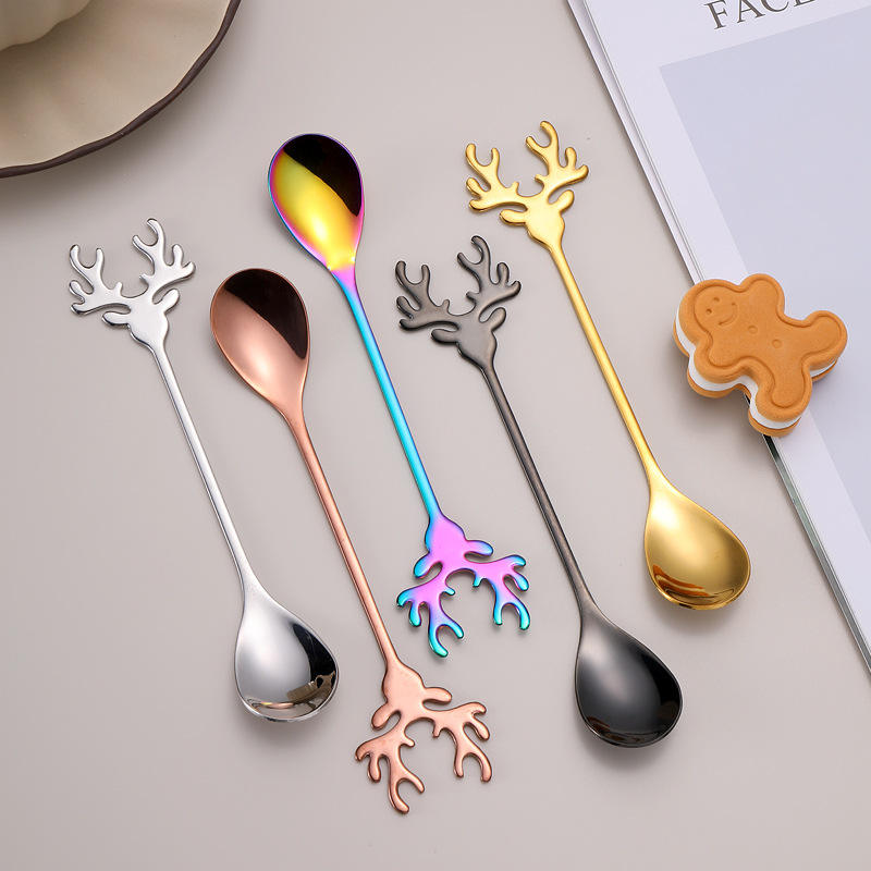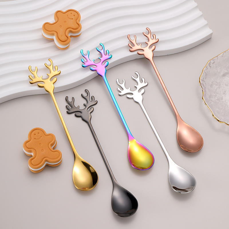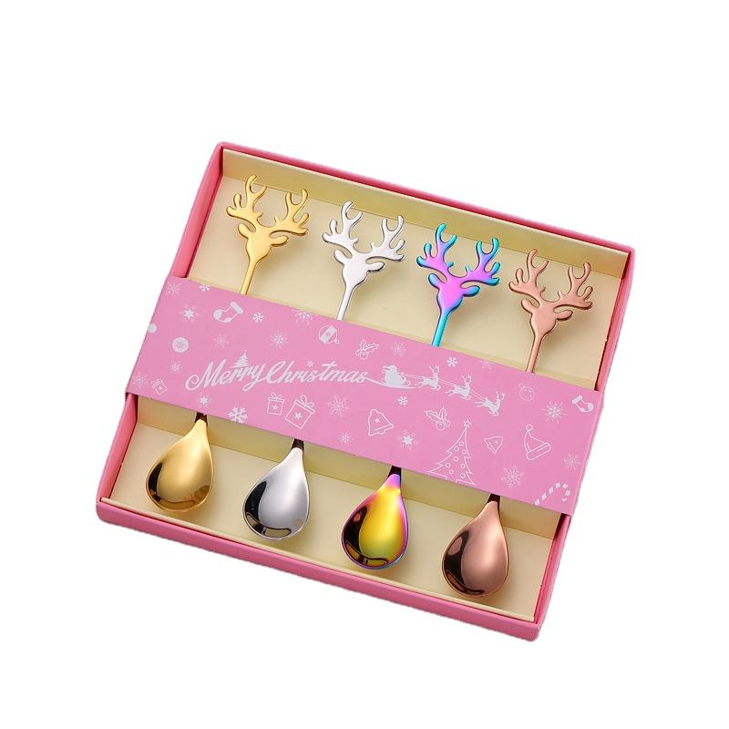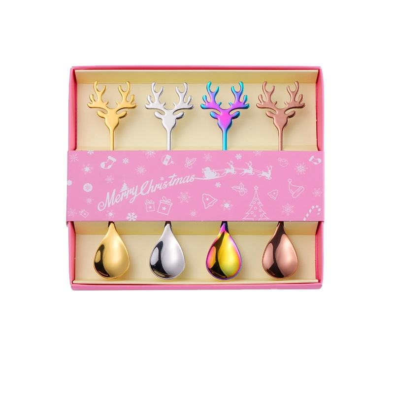 Bencircle เขากวางเรนเดียร์ CT06มือจับช้อนกาแฟกล่องของขวัญคริสต์มาสสแตนเลสเครื่องใช้บนโต๊ะอาหารสีสันสดใสสำหรับใช้ในเทศกาล