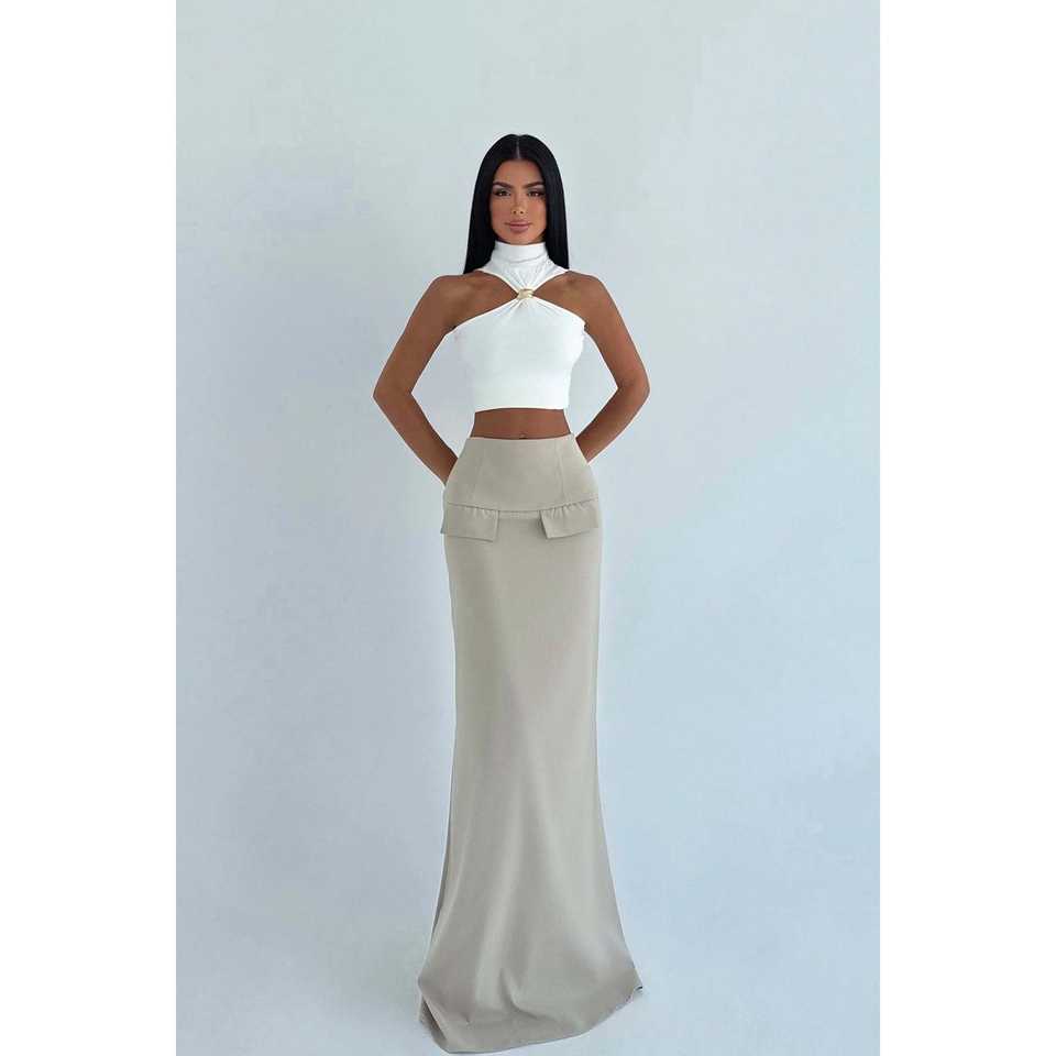 กระโปรงทรงดินสอครีมสี Benson พร้อมตกแต่งด้วยเลื่อม ไซส์ XS มีแบบพับจีบและแบบสั้นให้เลือก