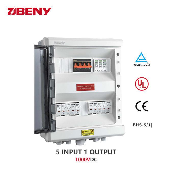 กล่องรวมสายไฟโซลาร์เซลล์ Beny รับประกัน 5 ปี 1000V IP65 DC PV แบบ 5 เข้า 1 ออก พร้อมใบรับรอง CE สำหรับรุ่น Solar-BHS-5-1 สำหรับใช้งานกลางแจ้ง