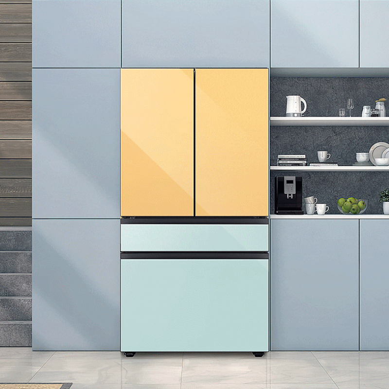 Bespoke 4-Door French Door Refrigerator (29 cu. ft.) with Center in Morning Blue Glass Top Panels