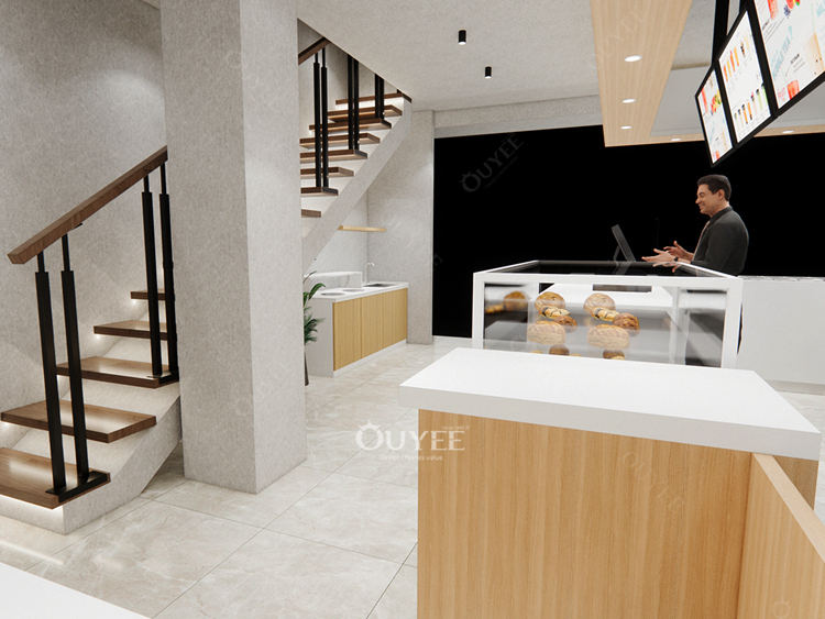 Bespoke ที่ติดตั้งเคาน์เตอร์ไม้ร้านกาแฟธุรกิจคาเฟ่การออกแบบตกแต่งภายในร้านกาแฟดีไซน์