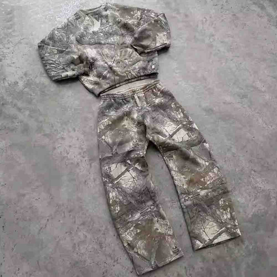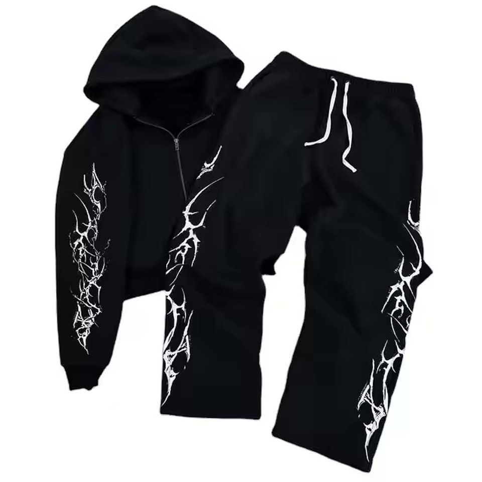 ชุดวอร์มประดับพลอยเทียมทรงหลวมที่มีชุดเสื้อผ้าที่ซักด้วยกรดประกอบด้วยเสื้อฮู้ดแบบรูดซิปและกางเกงวอร์ม
