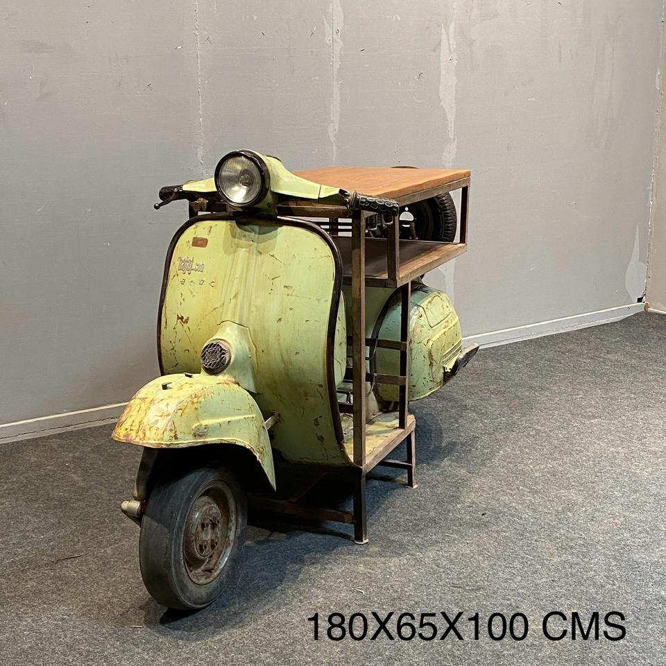 โต๊ะบาร์สกู๊ตเตอร์อุตสาหกรรมรีไซเคิลสุดคลาสสิก พร้อมชั้นวางไวน์เหล็กแข็งแรง ดีไซน์วินเทจ เฟอร์นิเจอร์เคาน์เตอร์โบราณ ศิลปะหิมาลัย