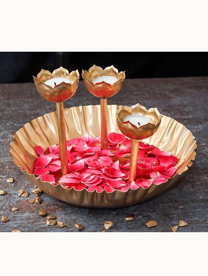ถาดทองเหลืองตกแต่งสวยงาม ลายดอกบัว ดีไซน์ตอกลาย สำหรับงานพิธีกรรม งานดีวาลี คริสต์มาส ชุบเคลือบไฟฟ้า ขนาดใหญ่