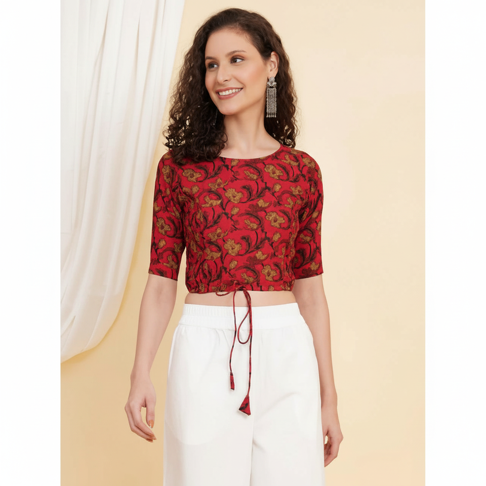 คอลเลคชั่นนักออกแบบที่ดีที่สุดเสื้อคอกลมแขนสั้นผ้าฝ้ายพิมพ์ลายดอกไม้สีแดงเข้มแนววินเทจสไตล์น่ารักคุณภาพสูง