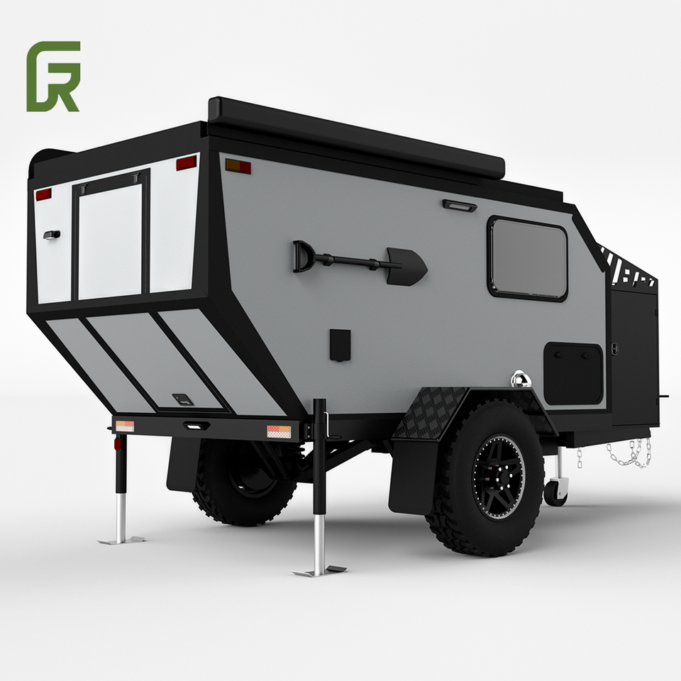 รถพ่วงสำหรับตั้งแคมป์แบบอิสระรถมอเตอร์ไซด์ไฟเบอร์กลาสขนาดเล็กพร้อมฟังก์ชั่นเคลื่อนย้ายได้และรองรับเต็นท์สำหรับตั้งแคมป์