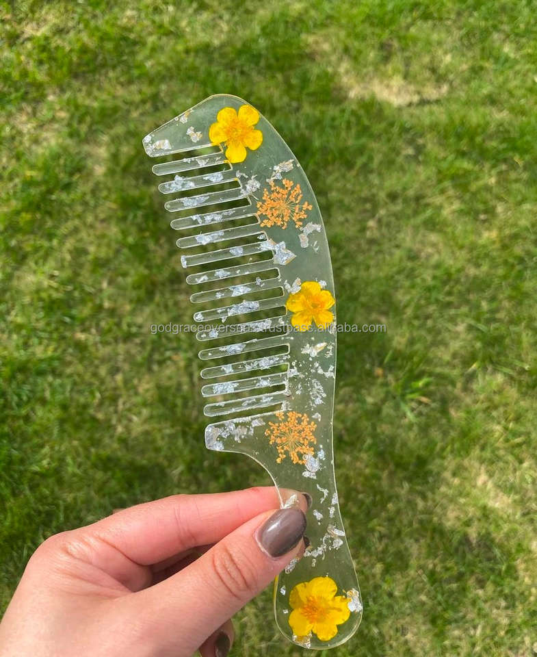 หวีผมสีขาวดอกไม้แห้งที่ดีที่สุดทำจากเรซิ่นหวีอะซิเตทหวีกระเป๋าหวีอุปกรณ์ผมน่ารัก