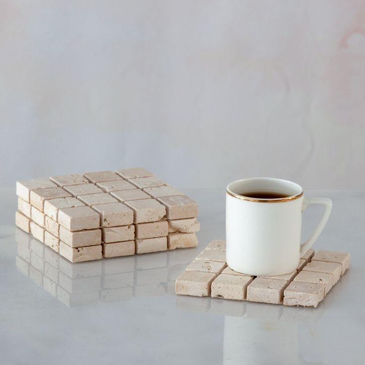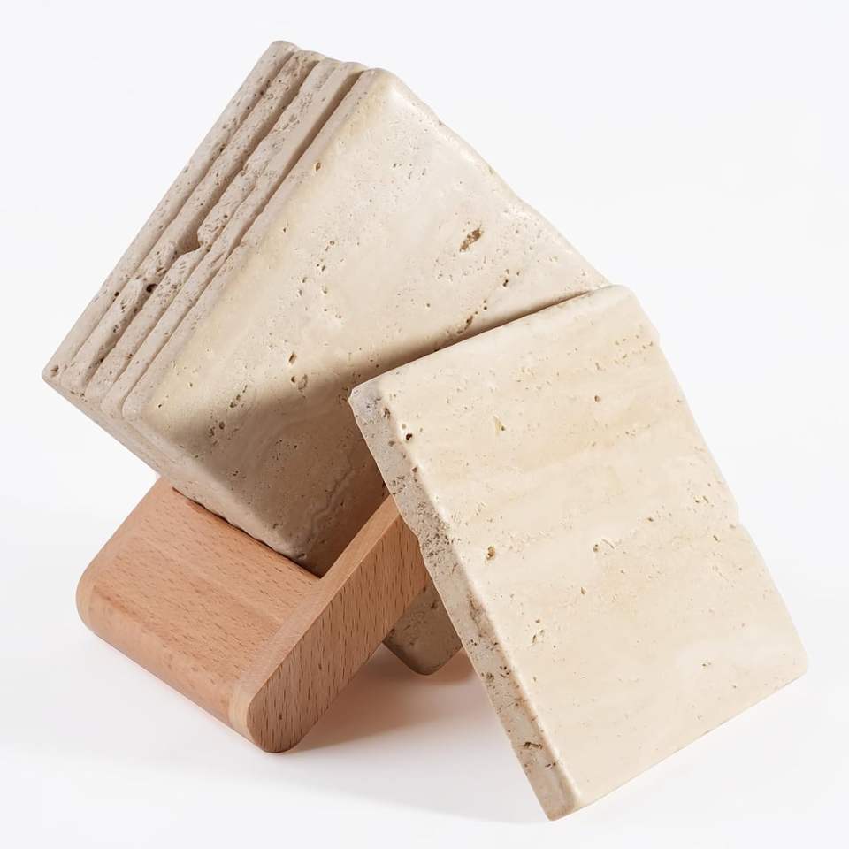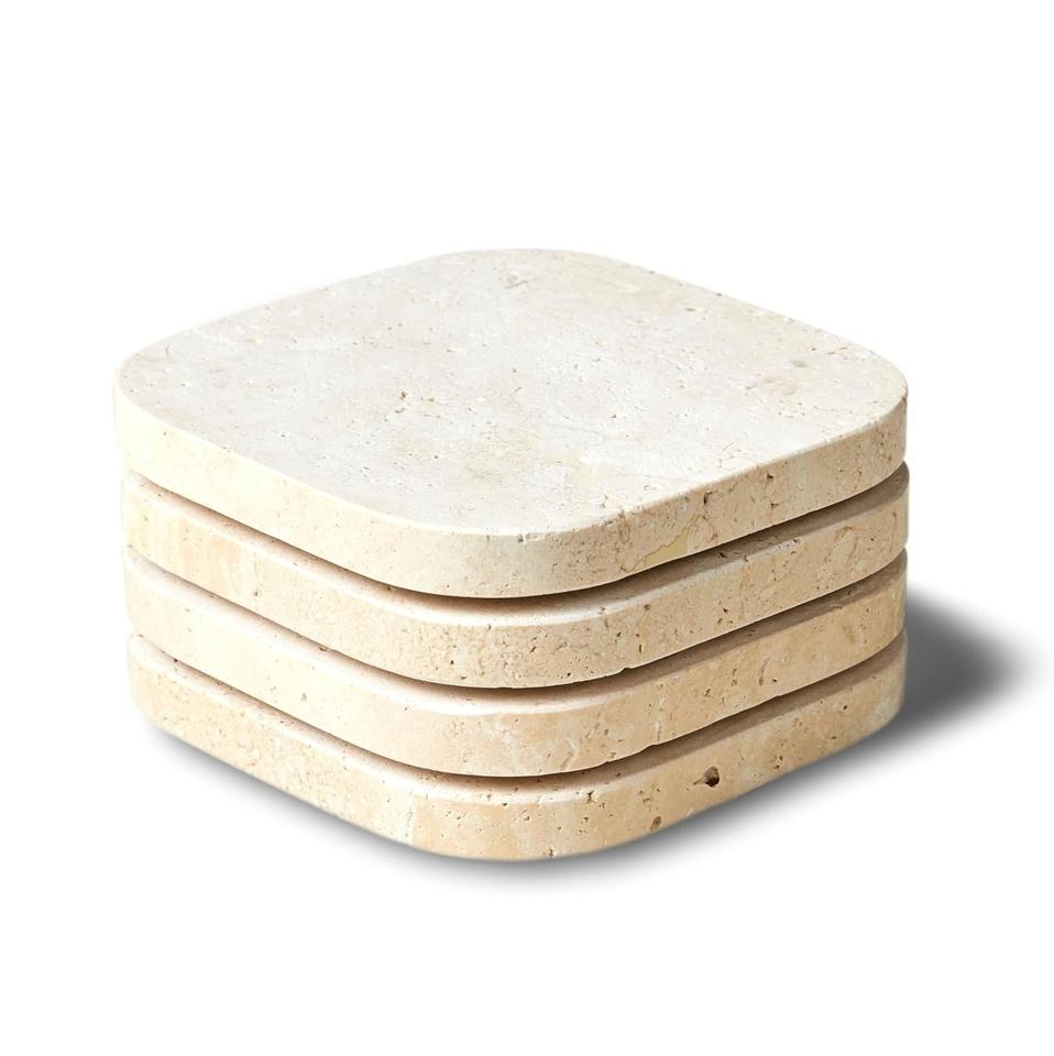 ที่รองแก้วหินเรียบลายทราเวิร์ตินทำด้วยมือที่ดีที่สุดพร้อมชุดขาตั้งไม้อุปกรณ์ดื่มที่ทนทานสี่ชิ้นไอเดียของขวัญที่สมบูรณ์แบบ