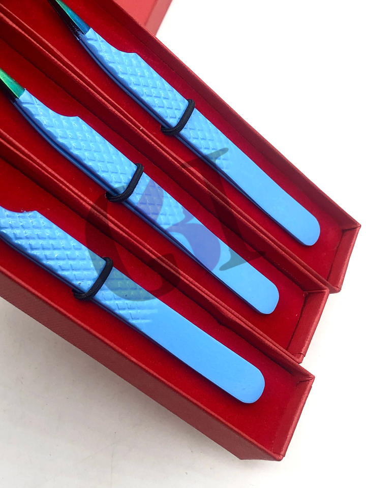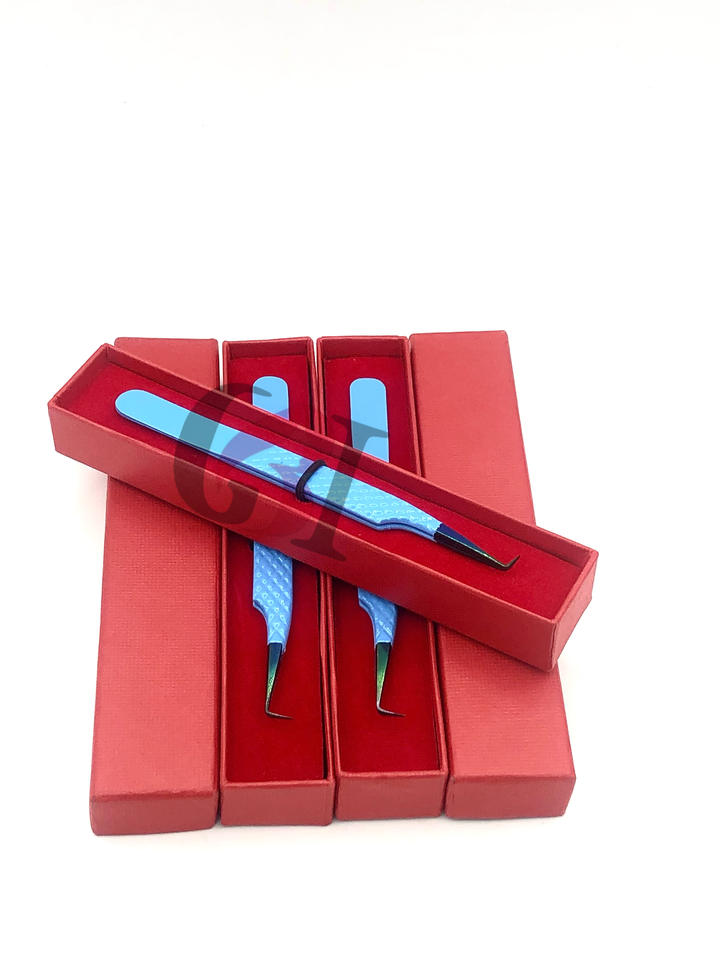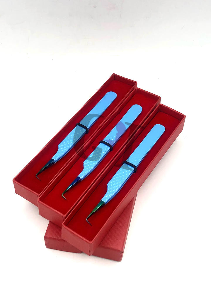 แหนบต่อขนตา90องศาทำจากสเตนเลสสตีลเคลือบผงสีฟ้าพร้อมปลายสายรุ้ง