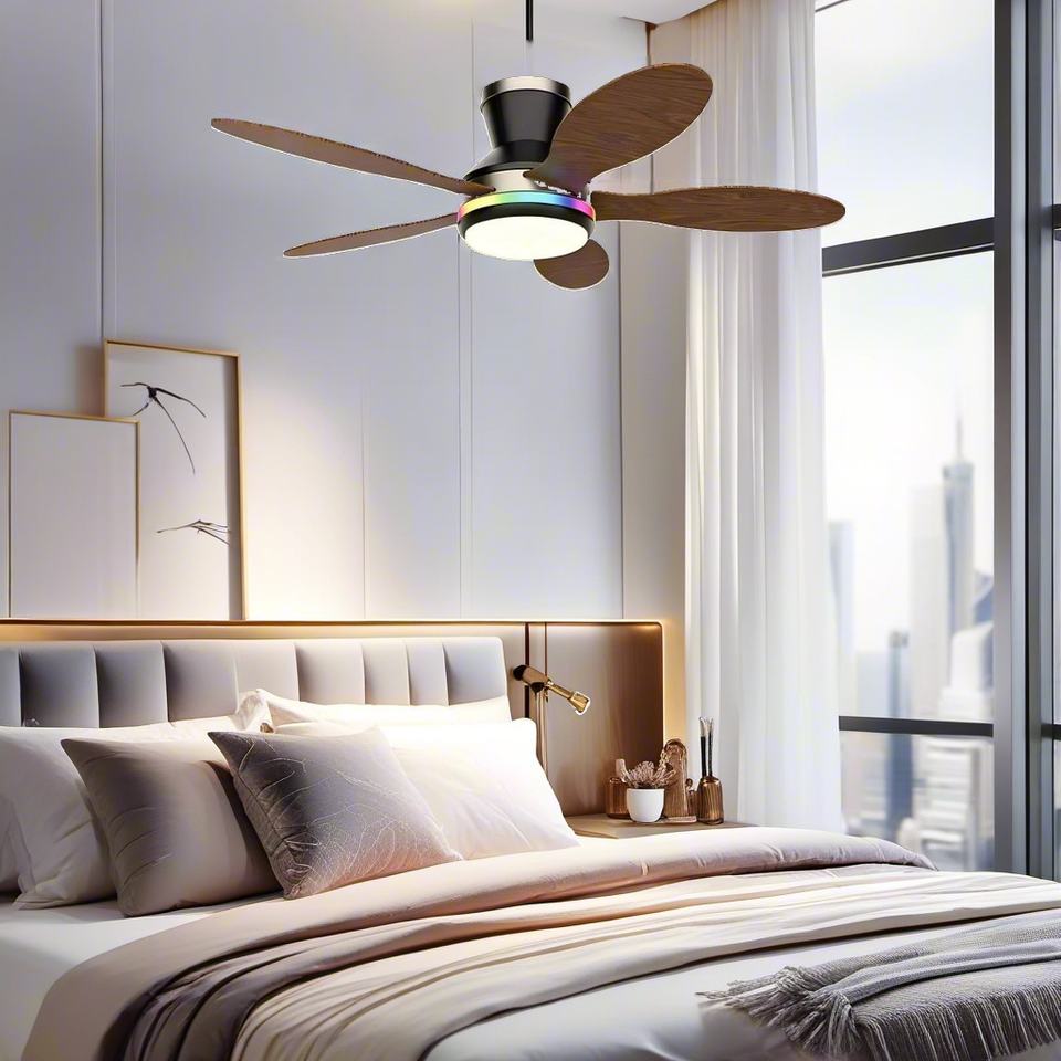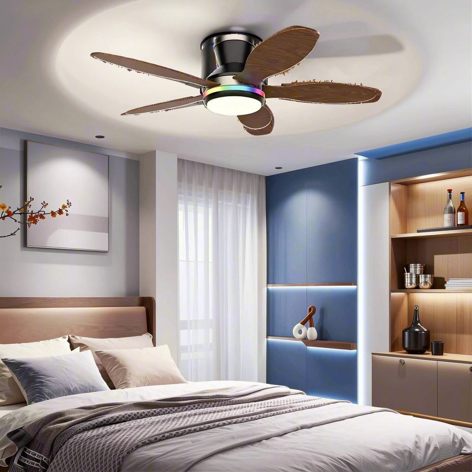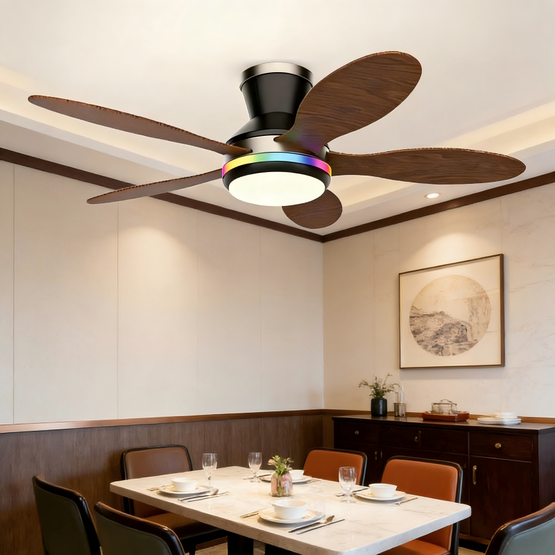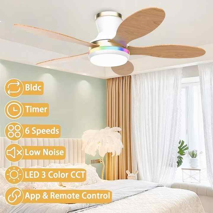 พัดลมเพดานไม้ปะไม้ LED สไตล์โมเดิร์นอุตสาหกรรมที่ดีที่สุด พร้อมใบพัด 5 ใบ มอเตอร์ DC 6 ระดับความเร็ว ควบคุมด้วยรีโมทอัจฉริยะ ปรับความสว่างได้ และค่า CRI สูง 95