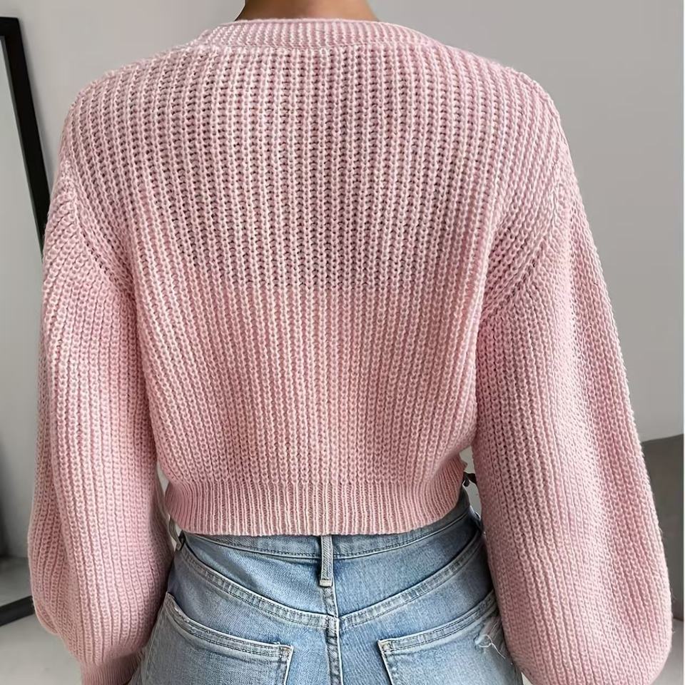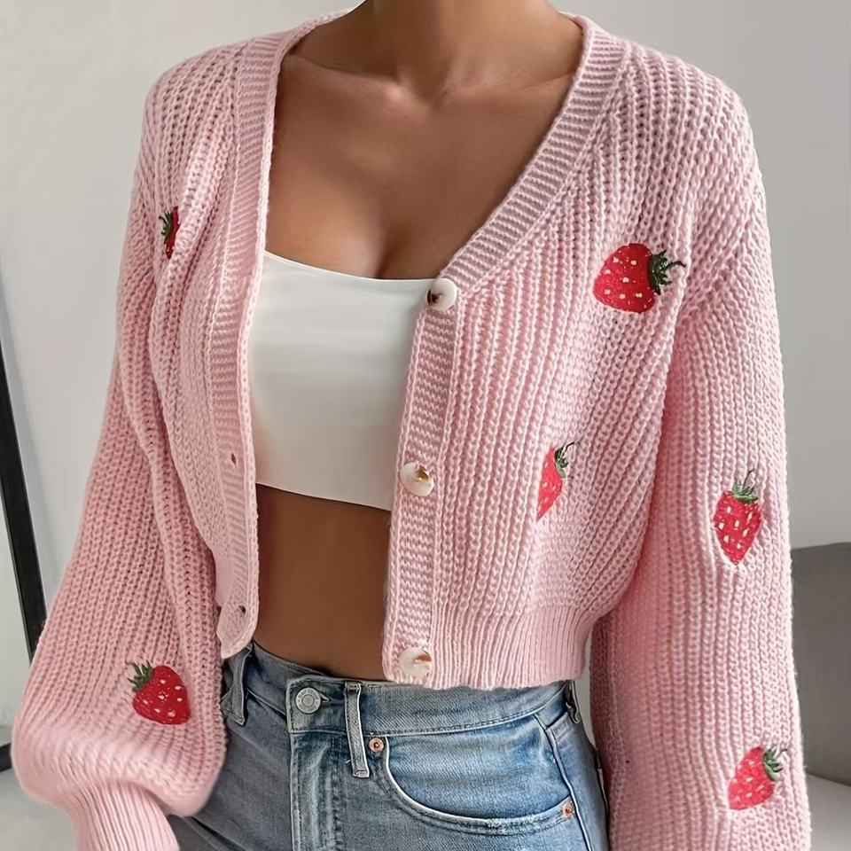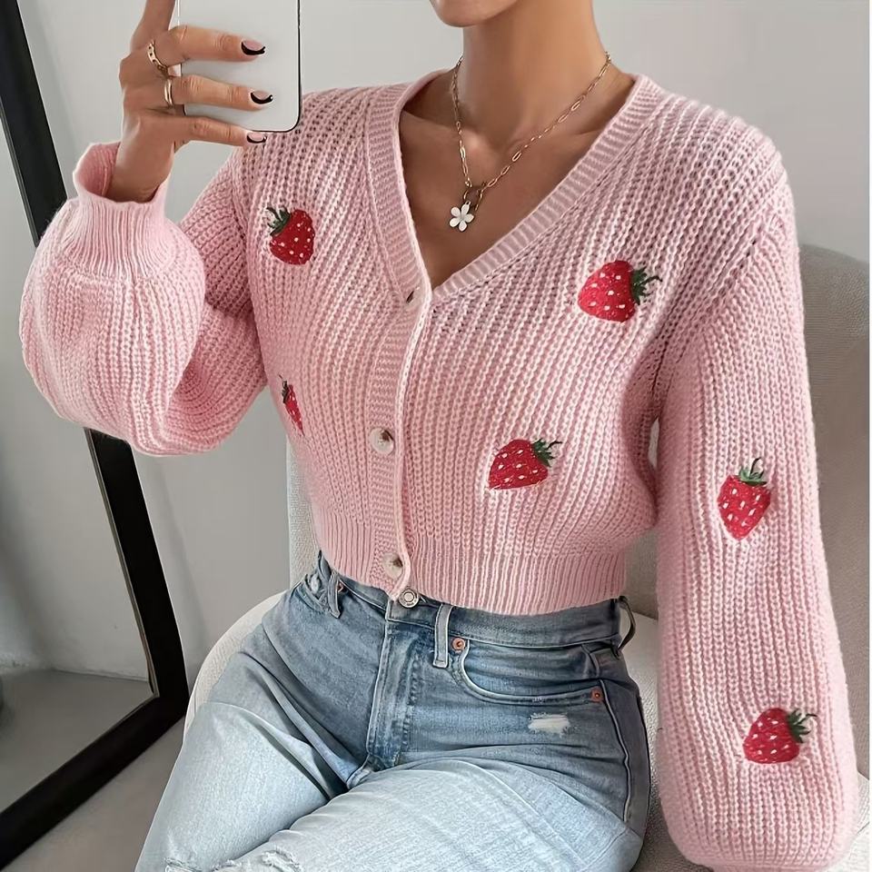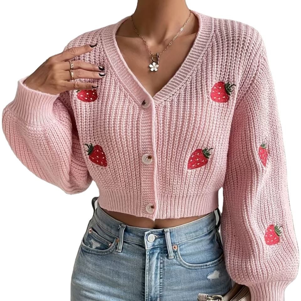 เสื้อสเวตเตอร์ถักคอวีของผู้หญิงเสื้อสเวตเตอร์แฟชั่นกันยับปักลายสตรอเบอรี่สินค้าใหม่2025