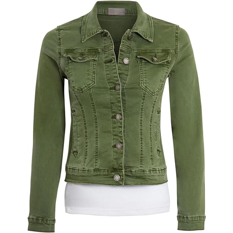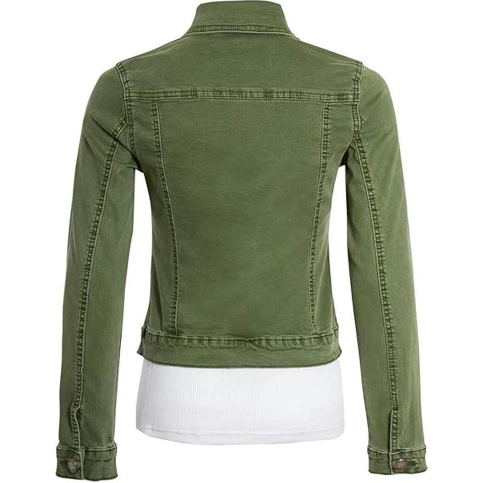 ผู้ผลิตชั้นนำจากปากีสถาน แจ็คเก็ตยีนส์ผ้าฝ้ายคุณภาพสูงสำหรับผู้หญิง ขายส่ง แบบสั่งทำ สไตล์หวาน ปุ่มติด ล้างสีเขียว สำหรับฤดูหนาว