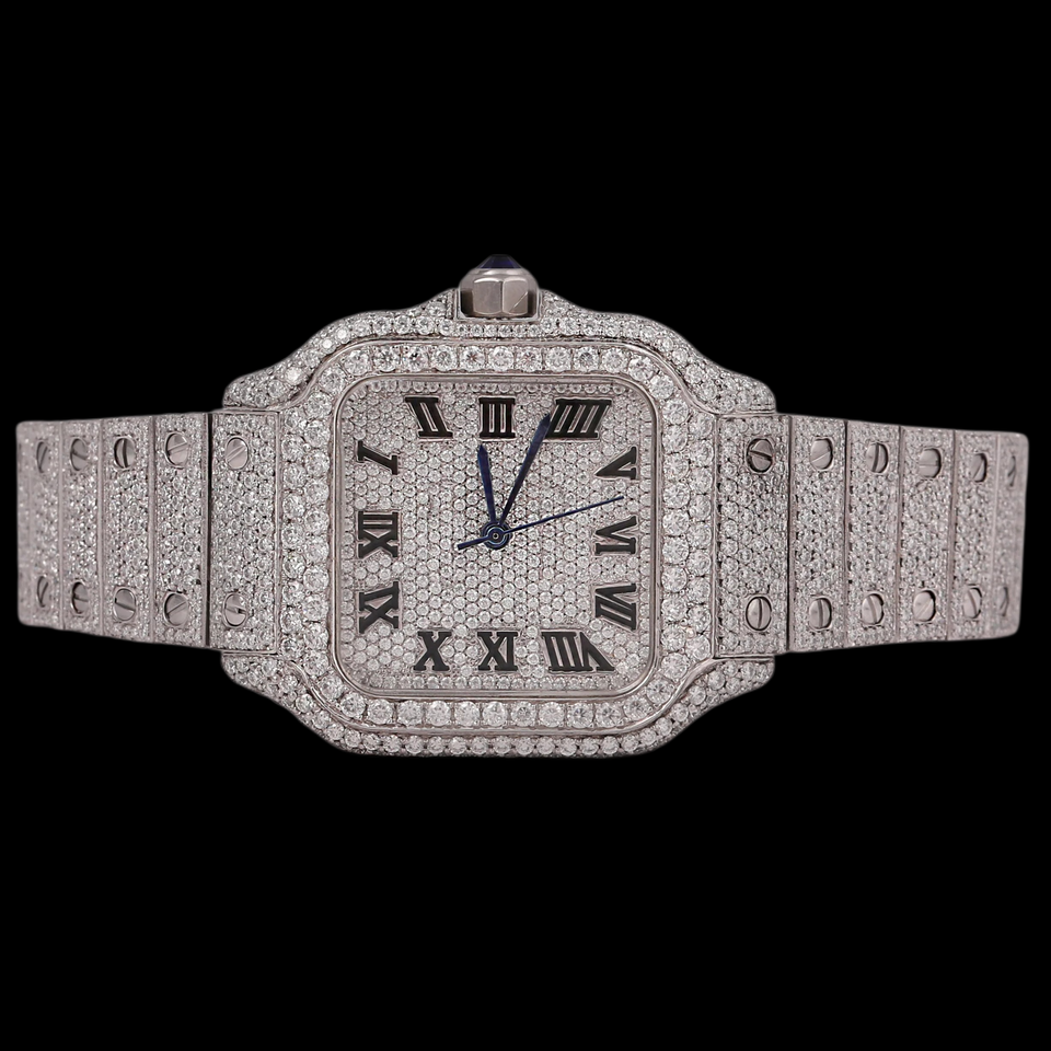 นาฬิกาควอตซ์สไตล์ฮิปฮอปสุดหรู ประดับเพชรโมอิสซาไนต์เต็มหน้าปัดทรงสี่เหลี่ยม พร้อมตัวเลขโรมันแบบกำหนดเองได้