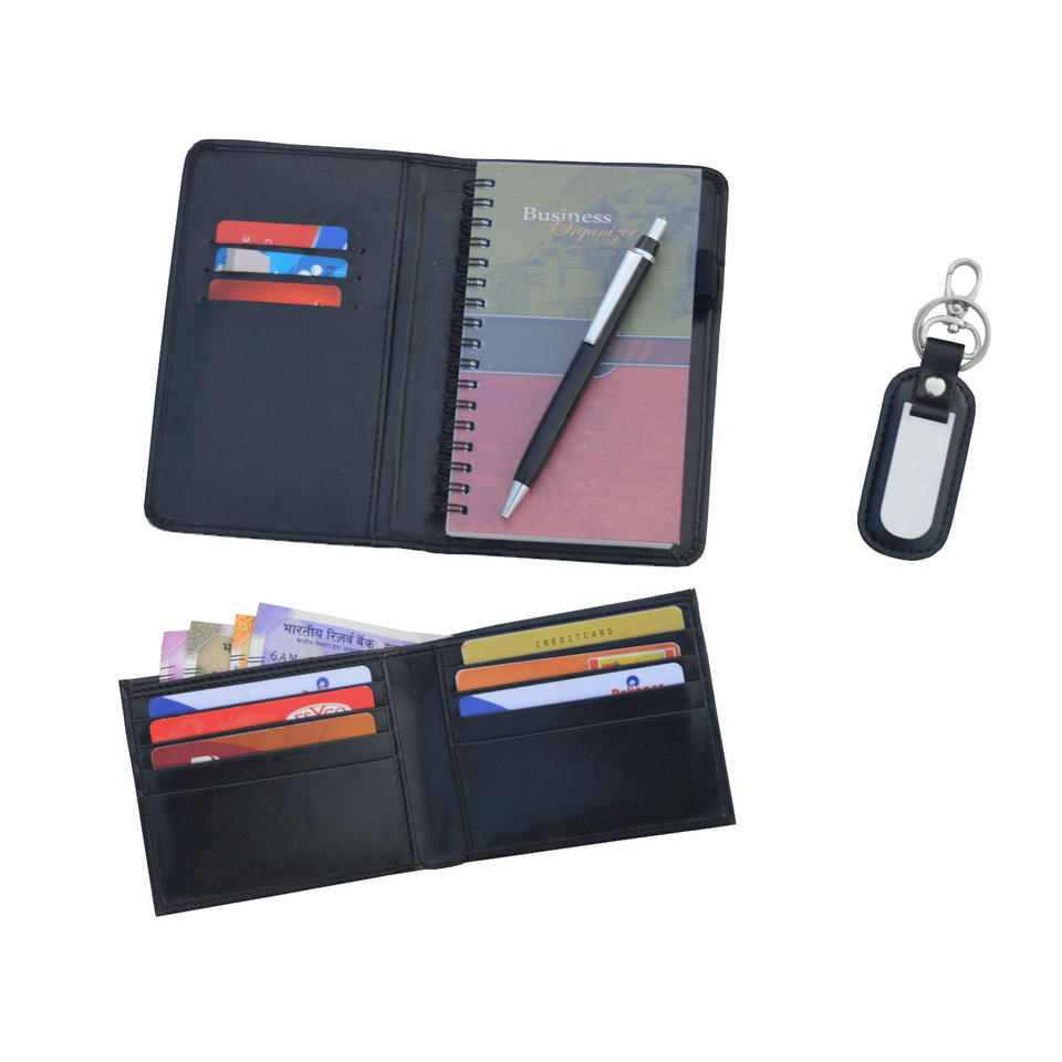 กระเป๋าสตางค์หนังสีดำสุดพรีเมี่ยมชุดของขวัญพวงกุญแจปากกาพวงกุญแจโลโก้ที่กำหนดเองของขวัญคริสต์มาส/ปีใหม่สำหรับพี่ชายสามีแฟนหนุ่ม