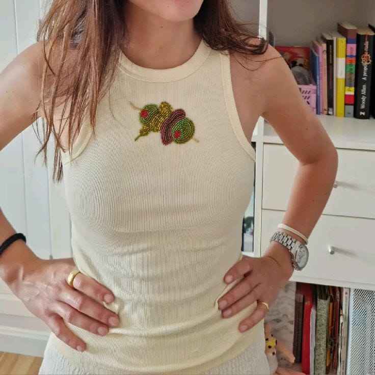 เสื้อยืดผู้หญิงแขนสั้นสีเบจผ้าฝ้ายปักลายต้นปาล์ม งานปักมือ ดีไซน์กราฟิก สไตล์ลำลอง เสื้อถักสำหรับฤดูร้อน ราคาสุดคุ้ม