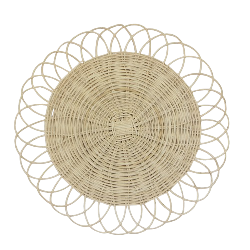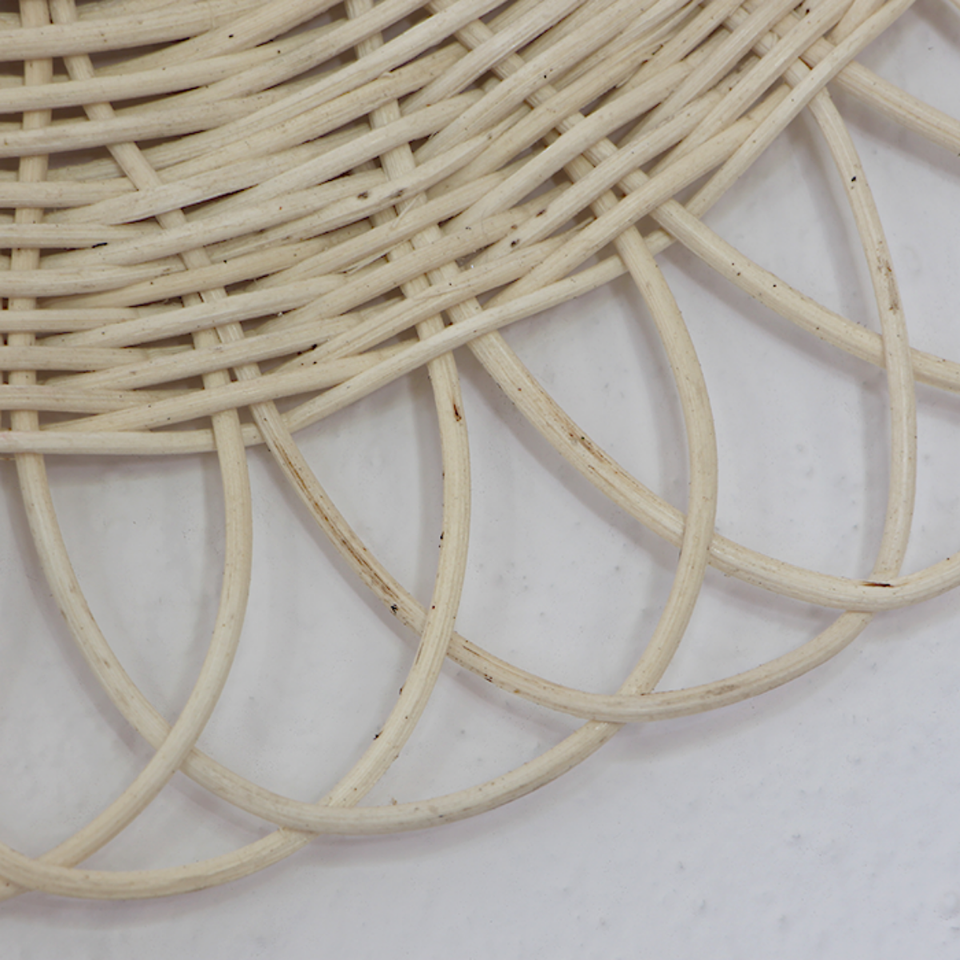 แผ่นหวายตกแต่งผนังเป็นมิตรกับสิ่งแวดล้อมขอบดอกไม้ทรงกลมทอสีเบจผนังศิลปะตกแต่งบ้านสำหรับห้องนั่งเล่นและโรงแรมสไตล์โบโฮ