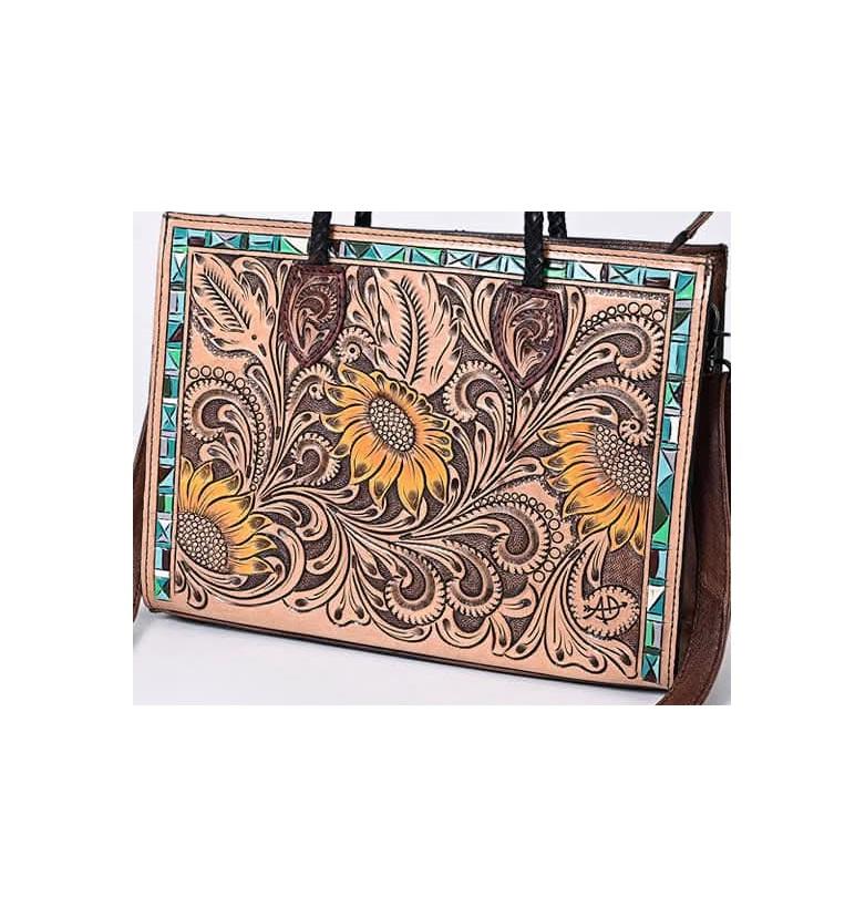 กระเป๋าซิปสะพายไหล่ของผู้หญิงหนังสีน้ำตาลดีไซน์ชิ้นเล็กลายดอกไม้สไตล์วินเทจ