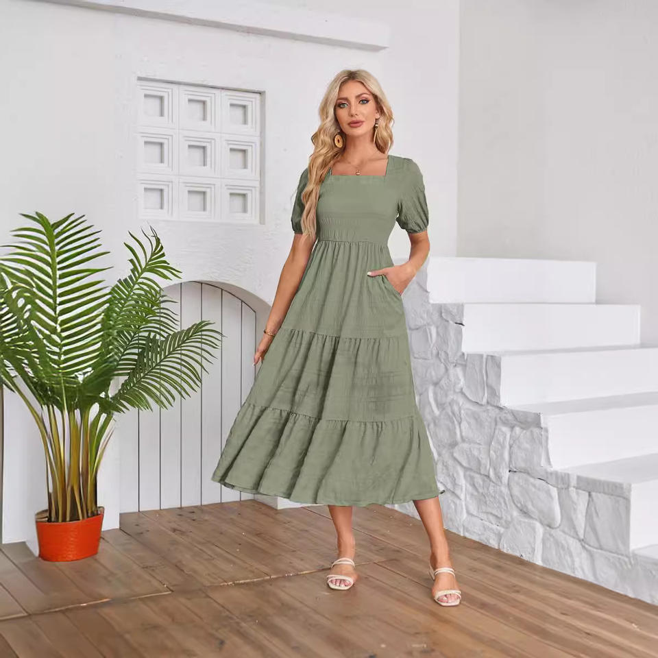 คำอธิบาย:เดรสมิดิเอวสูงทรงหลวมแต่งระบายเป็นชั้นๆแบบลำลองสีพื้น