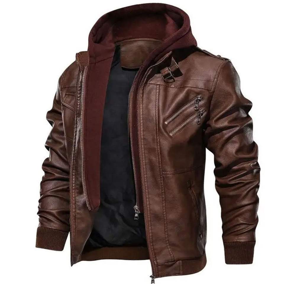 แจ็กเก็ตหนังมีฮู้ดสำหรับผู้ชายแจ็กเก็ตหนังแฟชั่นทำจากวัสดุผ้าปากีสถานทำตามสั่ง
