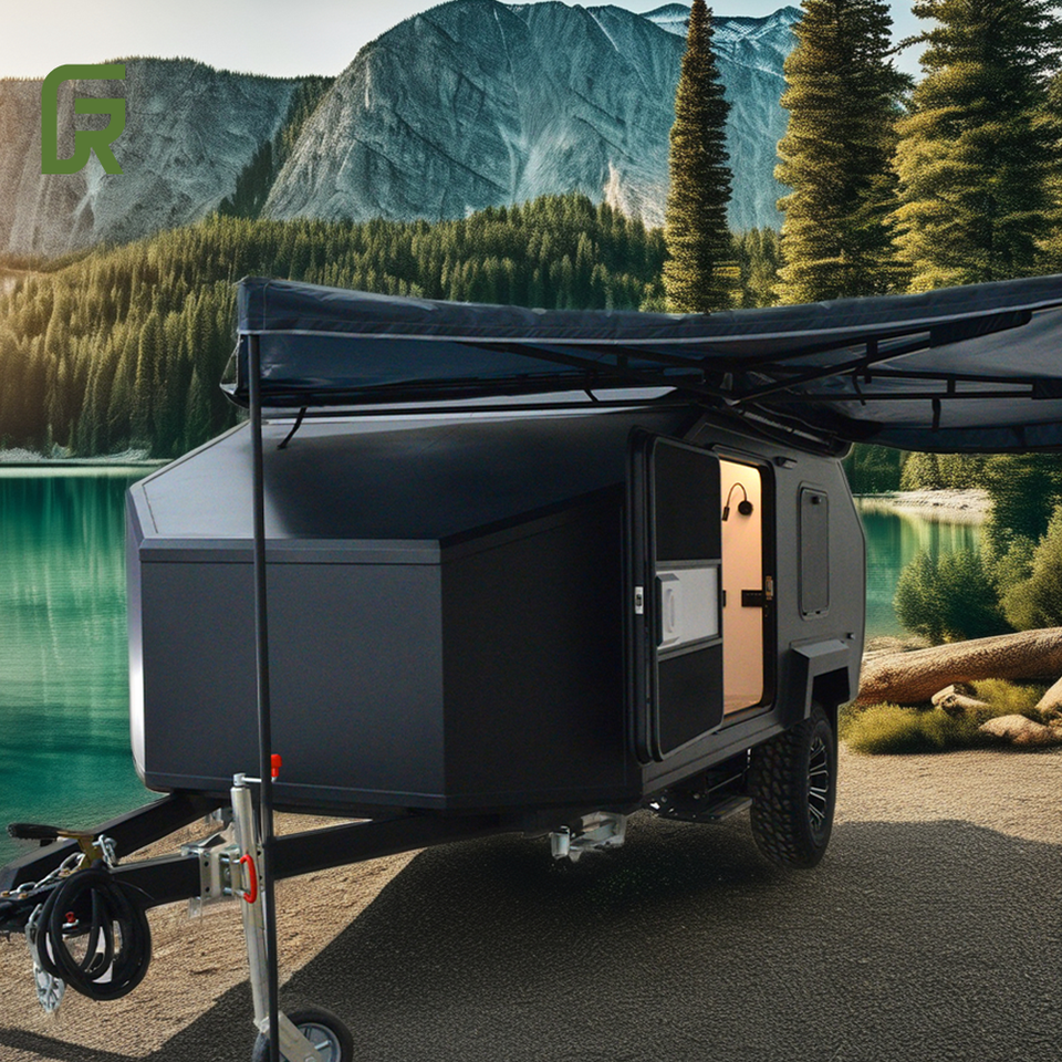 รถพ่วงสำหรับตั้งแคมป์แบบอิสระรถมอเตอร์ไซด์ไฟเบอร์กลาสขนาดเล็กพร้อมฟังก์ชั่นเคลื่อนย้ายได้และรองรับเต็นท์สำหรับตั้งแคมป์