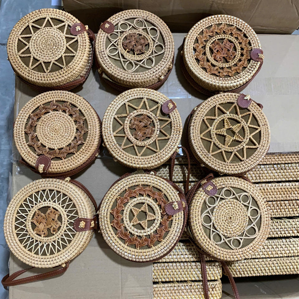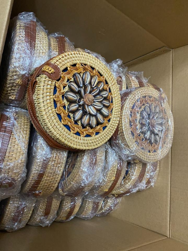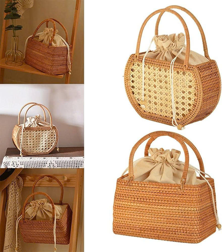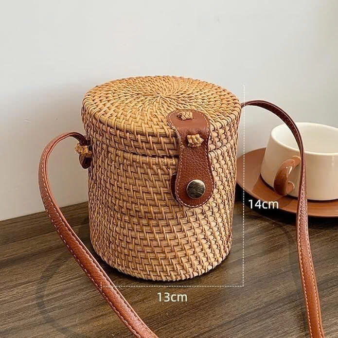 กระเป๋าหวายทรงกลมราคาสุดคุ้ม พร้อมเปลือกหอยถักทอ กระเป๋าทรงถังหวายสไตล์ฤดูร้อน กระเป๋าสะพายไหล่โครเชต์สำหรับสุภาพสตรี