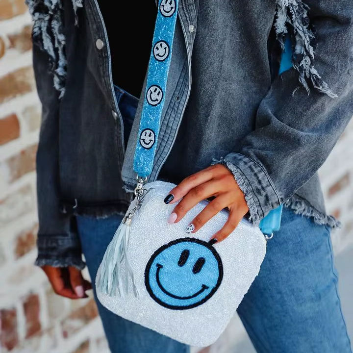 กระเป๋าสะพายข้างทรงสี่เหลี่ยมผ้าแคนวาสสีขาว ประดับลูกปัดลายหน้ายิ้มสีฟ้า ราคาสุดคุ้ม สายสะพายลูกปัดถอดได้