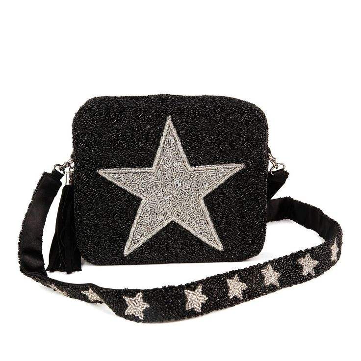 กระเป๋าถือสะพายข้างทรงสี่เหลี่ยมผ้าสีดำประดับลูกปัดรูปดาวขนาดใหญ่ ราคาสุดคุ้ม สายสะพายถอดได้ เหมาะสำหรับผู้หญิง ใช้ในช่วงเย็น มีซิป