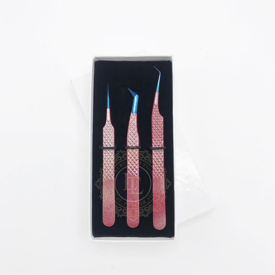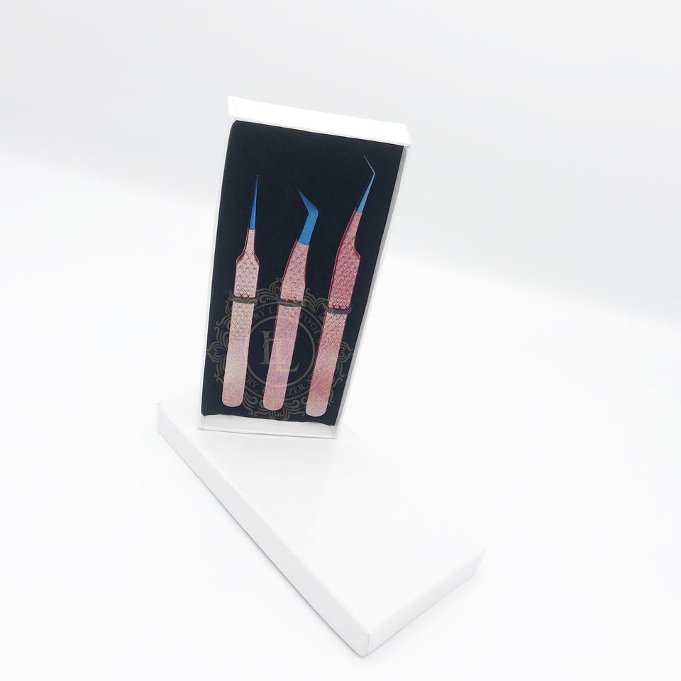 ที่หนีบขนตาทำจากเหล็กสแตนเลสเคลือบผงกลิตเตอร์สีเงินมีเพชรปลายแหลมสีฟ้า