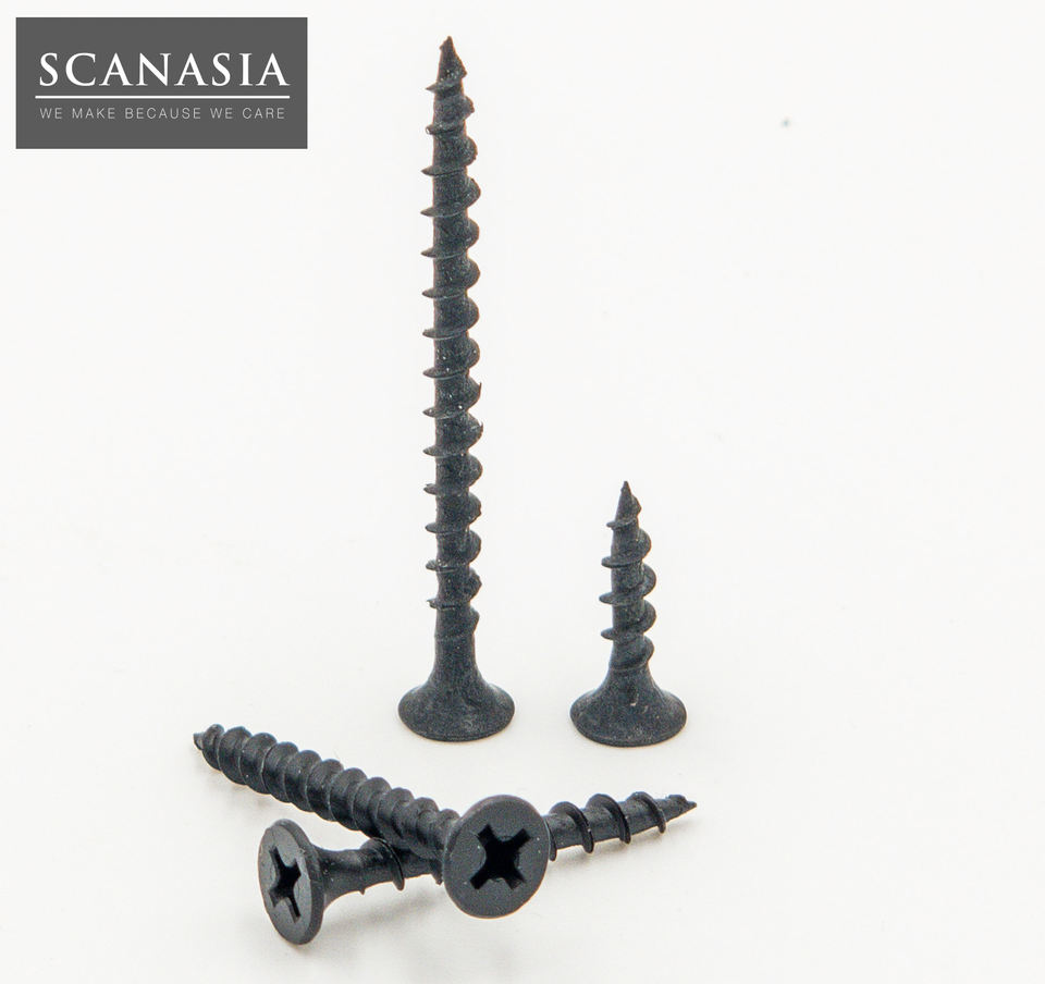 สกรูยึดผนังยี่ห้อไต้หวัน ราคาดีที่สุด ปลายแหลม ชุบฟอสเฟตสีดำ # 8 # เกลียวหยาบ 6 มิลลิเมตร มาตรฐาน DIN