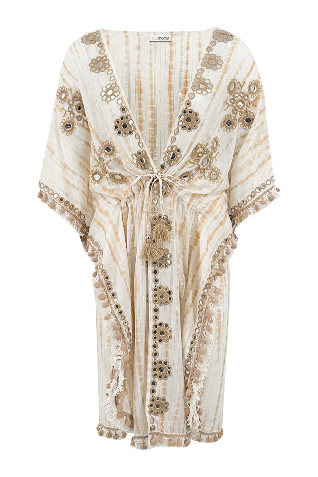 ชุดคลุมชายหาดคาฟตันแบบปักสั้นสไตล์อินเดียดั้งเดิมพร้อมพู่ห้อยเสื้อคลุมเครป100% โมร็อกโก