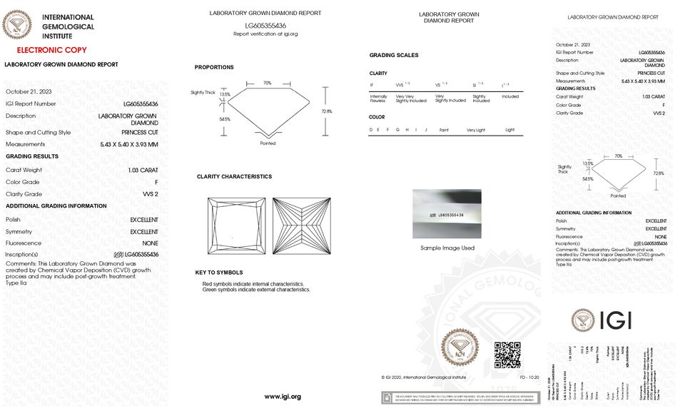 เพชรคุณภาพเยี่ยม 1.03 กะรัต ระดับความสะอาด VVS2 สี F รับรองโดย IGI เพชรเจียระไนทรงปรินเซส ผลิตในห้องปฏิบัติการ สำหรับผู้ชายและผู้หญิง เหมาะสำหรับงานหมั้นและงานแต่งงาน