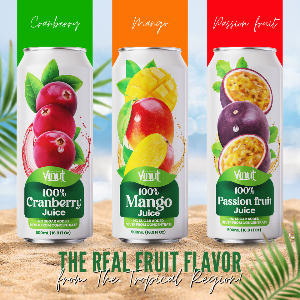 เครื่องดื่มน้ำผลไม้กระป๋อง100% ขนาด500มล. มีตัวอย่างแบบส่วนตัวผู้ผลิตจากเวียดนามขายส่ง