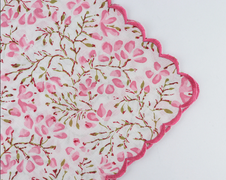 ผ้าเช็ดปากฝ้าย100% ลายดอกไม้อินเดียพิมพ์ลายดอกไม้สีเขียวหมักดองสีชมพู