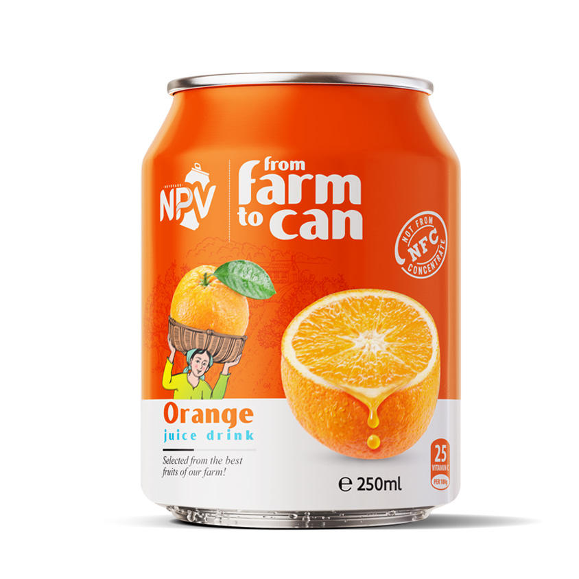 เครื่องดื่มน้ำส้มกระป๋องขนาด250มล. ติดฉลากส่วนตัวพร้อม MOQ ต่ำได้รับการรับรองมาตรฐาน ISO ฮาลาล