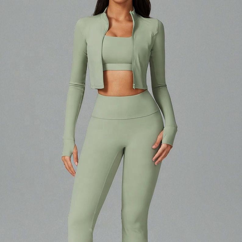 ชุดโยคะ 3 ชิ้น คุณภาพดีที่สุด พร้อมโลโก้ด้านหน้า น้ำหนักเบา ระบายอากาศได้ดี สำหรับผู้หญิง ผลิตในปากีสถาน ผ้ามีความยืดหยุ่นสี่ทิศทาง วัสดุคุณภาพสูง