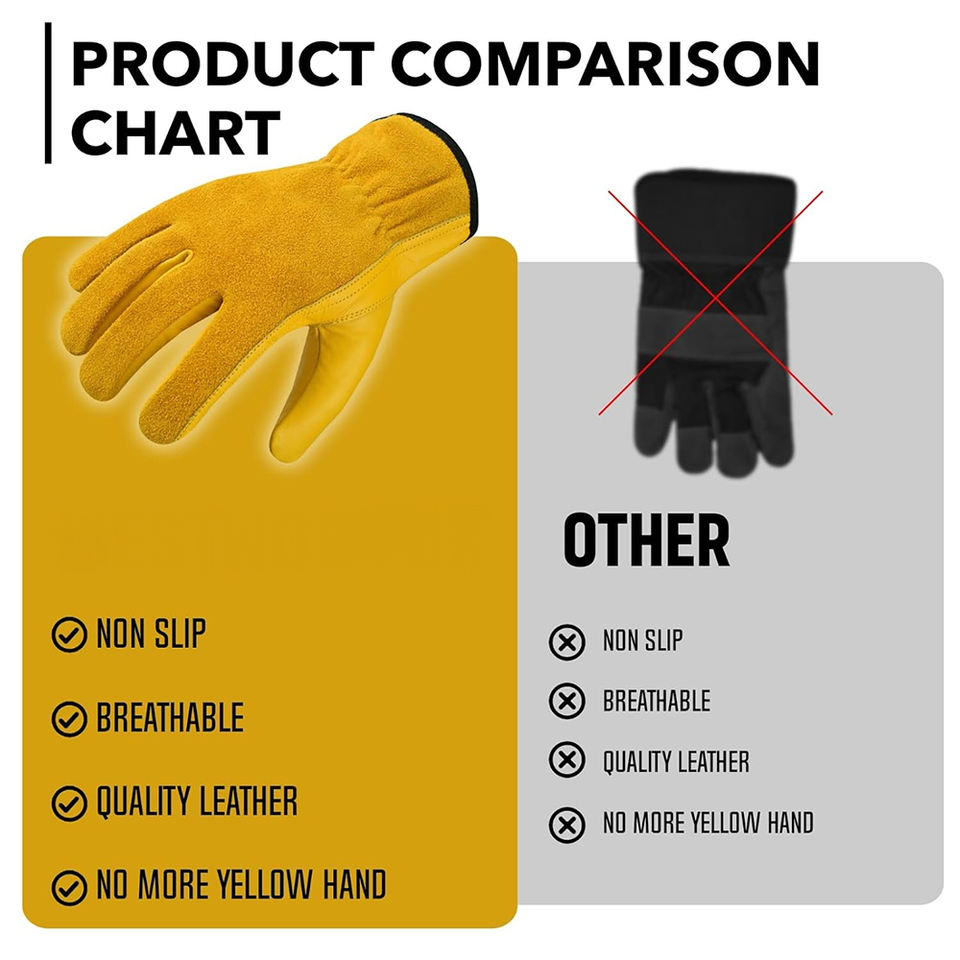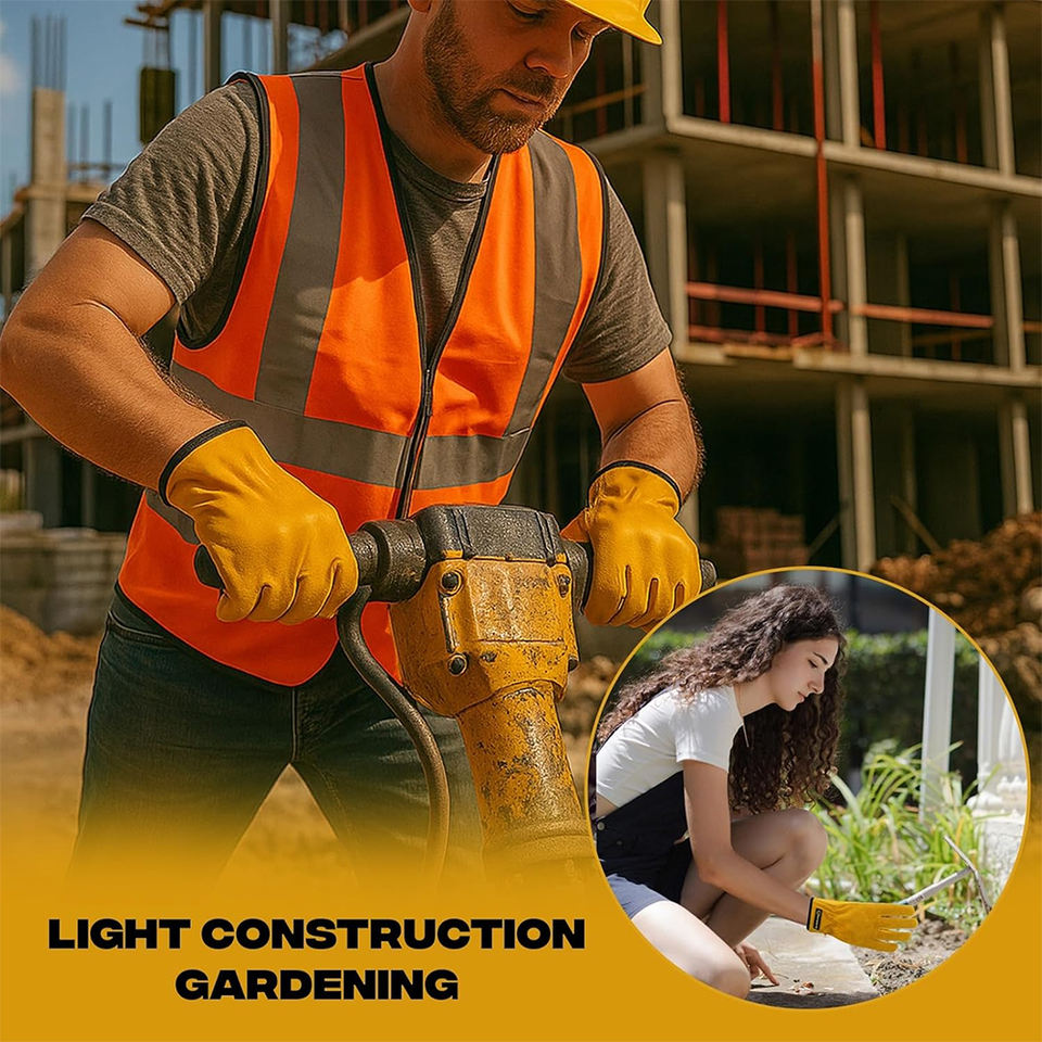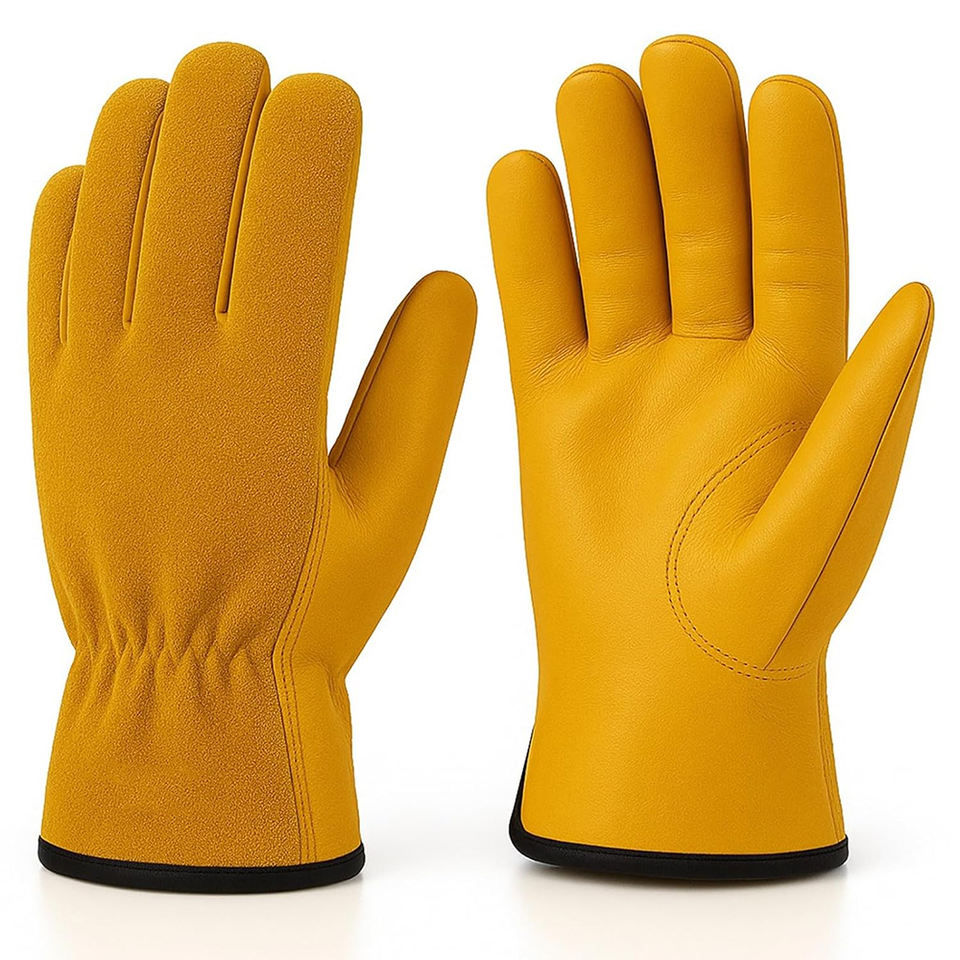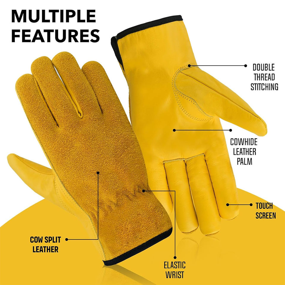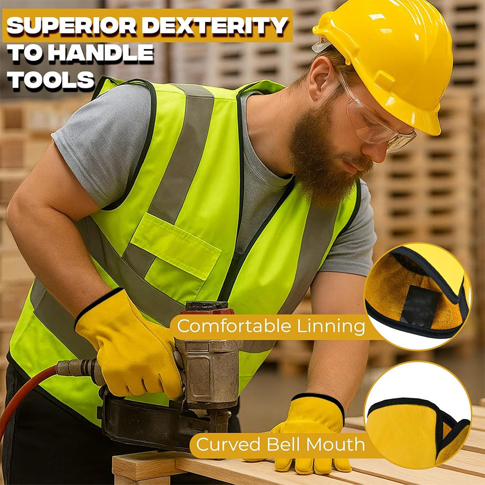 ถุงมือทำงานคุณภาพดี สีเหลือง หนังวัวแท้ สำหรับงานคลังสินค้า ทำสวน ประกอบชิ้นส่วน พร้อมสายรัดข้อมือแบบยืดหยุ่น