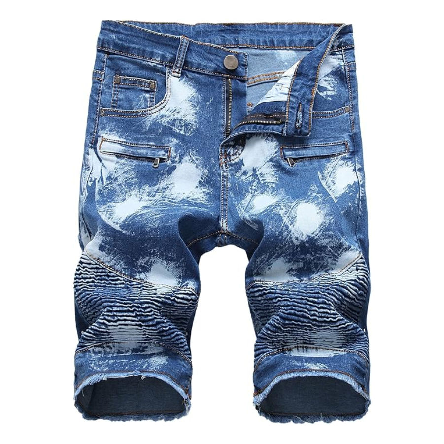 กางเกงขาสั้นผ้ายีนส์สีฟ้าขาตรงแบบถักสำหรับผู้ชายผ้าฝ้าย100% เป็นมิตรกับสิ่งแวดล้อมฤดูร้อนฤดูใบไม้ร่วง