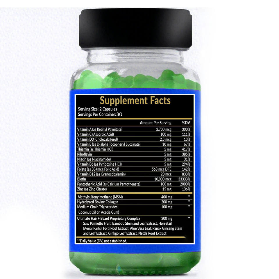 Biotin, MSM, Hydrolyzed Bovine Collagen, Medium Chain Triglycerides, Ultimate Hair+Beard Proprietary Blend, Pantothenic Acid, Zinc, Vitamin C, Vitamin A, Vitamin D3, Vitamin E, FolateMain Ingredient